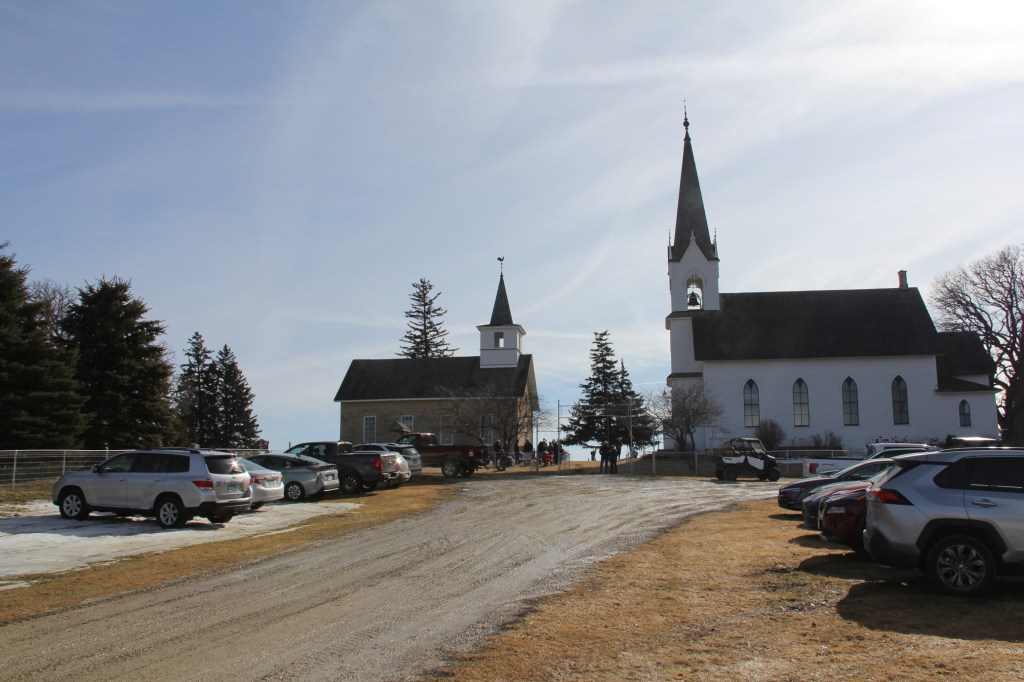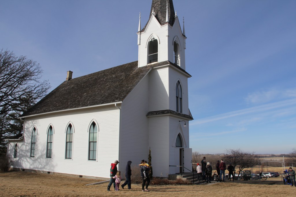 The beautiful wooden church, where the steeple was recently-restored and the bell was rung at the Doughnut Hole Roasting Party. (Minnesota Prairie Roots copyrighted photo February 2026)