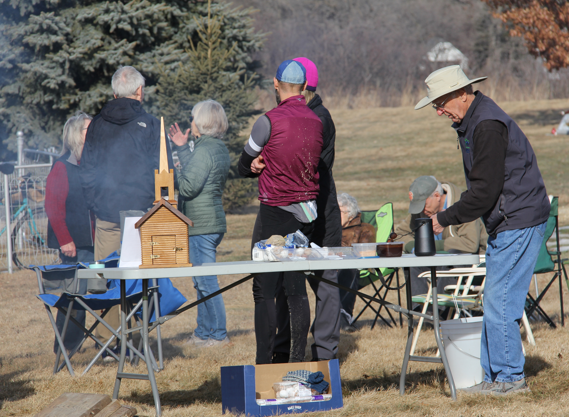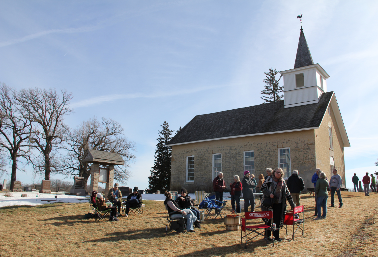 With the historic limestone church as a backdrop, people visit and roast doughnut holes. (Minnesota Prairie Roots copyrighted photo February 2026)