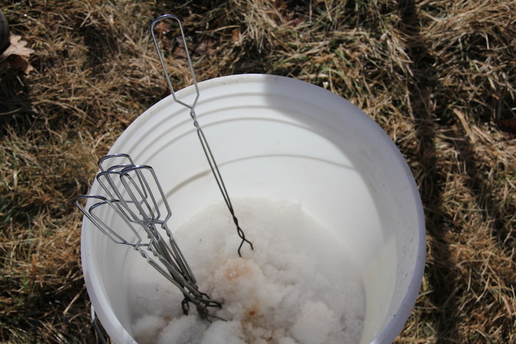 People stuck the metal roasting sticks in a bucket of snow when they were done roasting their doughnut holes. (Minnesota Prairie Roots copyrighted photo February 2026)