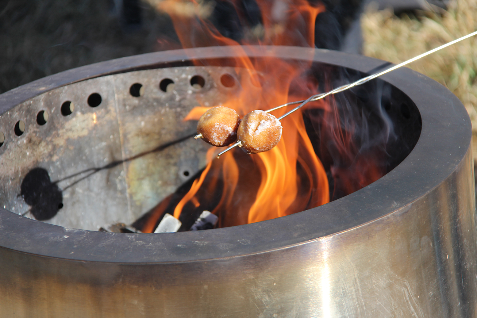 But on this day, we focused on doughnut holes forked onto metal roasting sticks and held over an open flame. Some roasted their treats to coal black, to caramelize the doughnuts I was told. Not fond of charred anything, I preferred mine heated then dipped in chocolate. They were sweet and tasty and messy. I found a shadowed patch of remnant snow to “wash” my sticky fingers.
