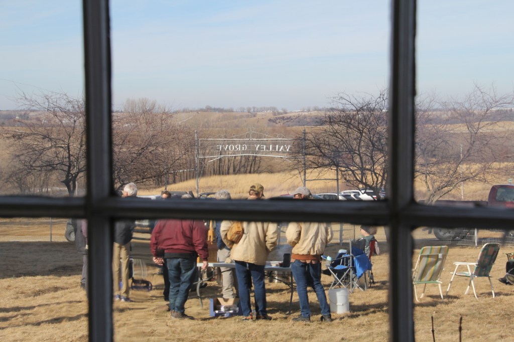 Looking through a window of the stone church, I photographed people gathering on the lawn for the Doughnut Hole Roasting Party. (Minnesota Prairie Roots copyrighted photo February 2026)
