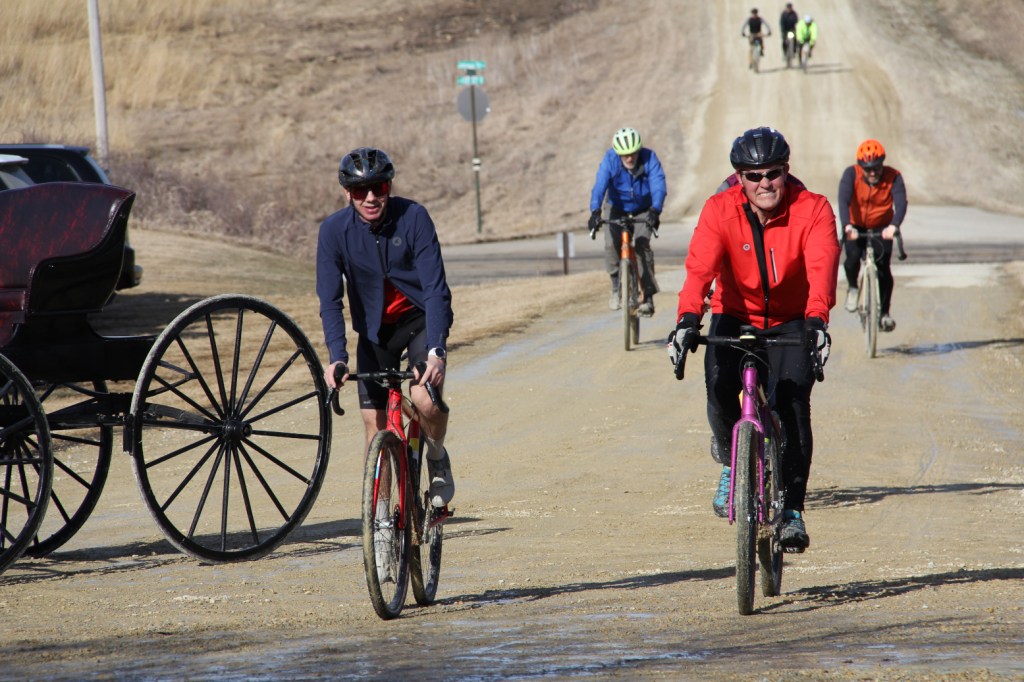 A group of bikers wheel up the hill to Valley Grove for the Doughnut Hole Roasting Party. (Minnesota Prairie Roots copyrighted photo February 2026)