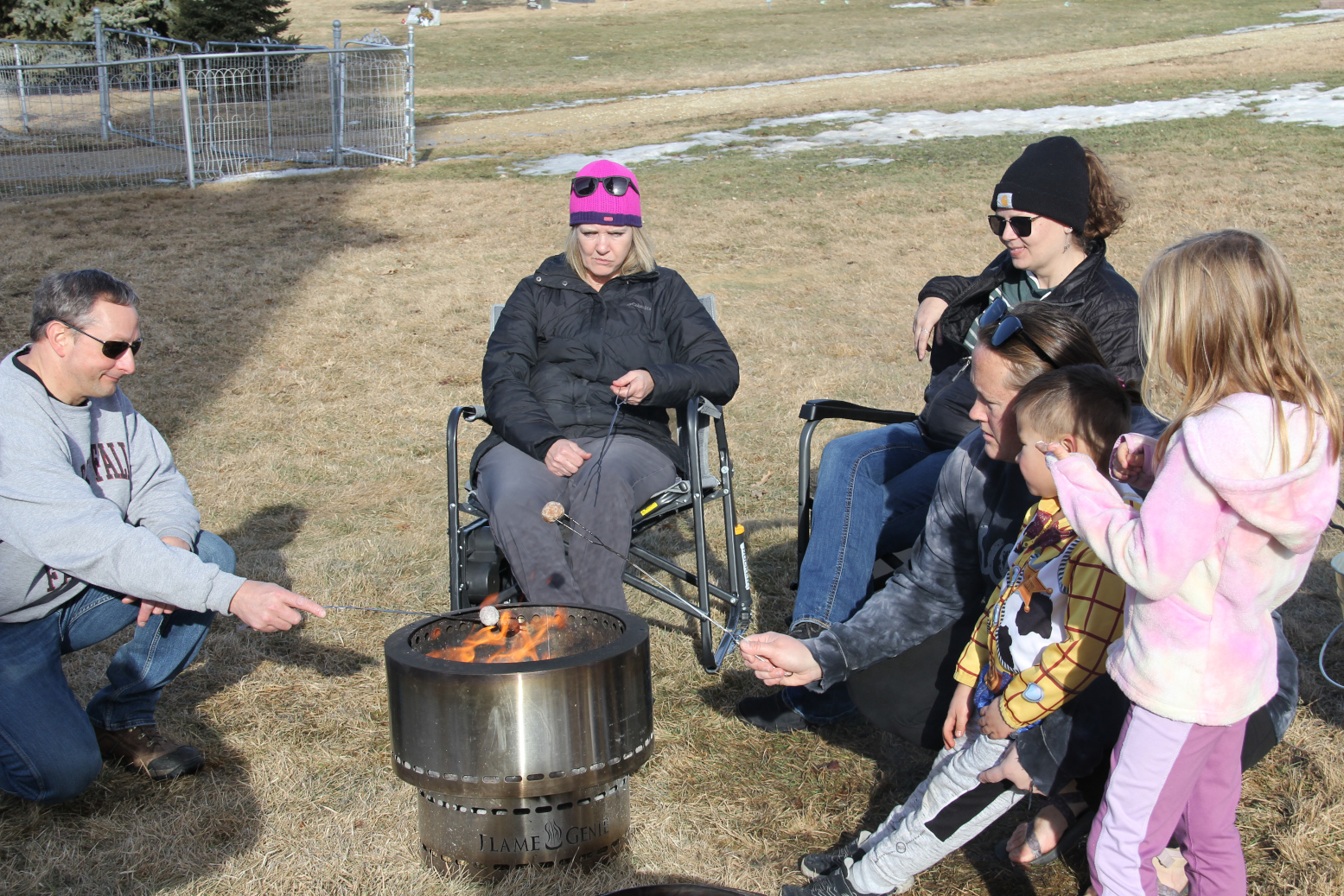 On the dormant lawn between the two churches, people clustered—standing, sitting in lawn chairs, bending, reaching over flames to roast doughnut holes on a Sunday afternoon in mid-February in southern Minnesota.