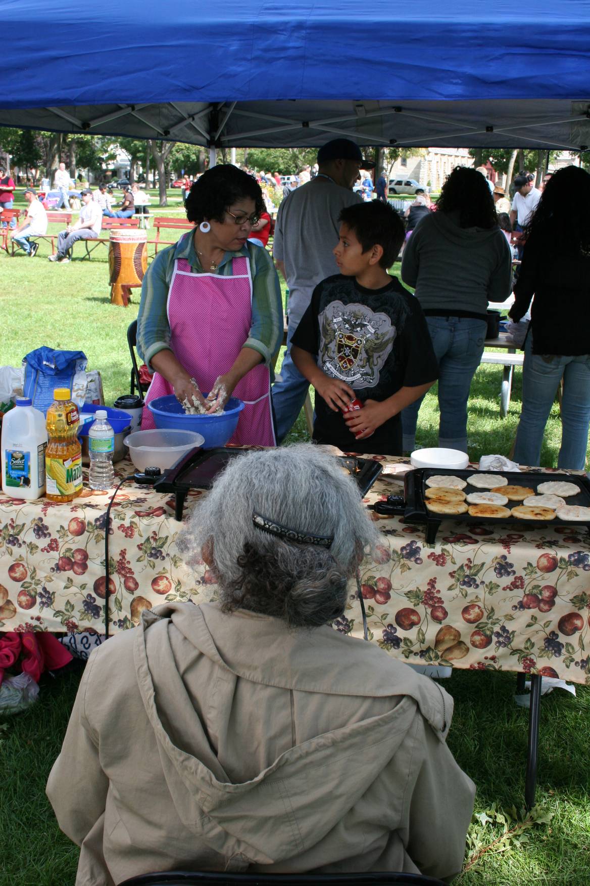 She sat, some five feet from a food tent during International Market Day at Central Park in Faribault. Under the tent, members of her extended family tended to frying pupusas and to customers who were waiting to buy the beef and cheese-filled flat bread.