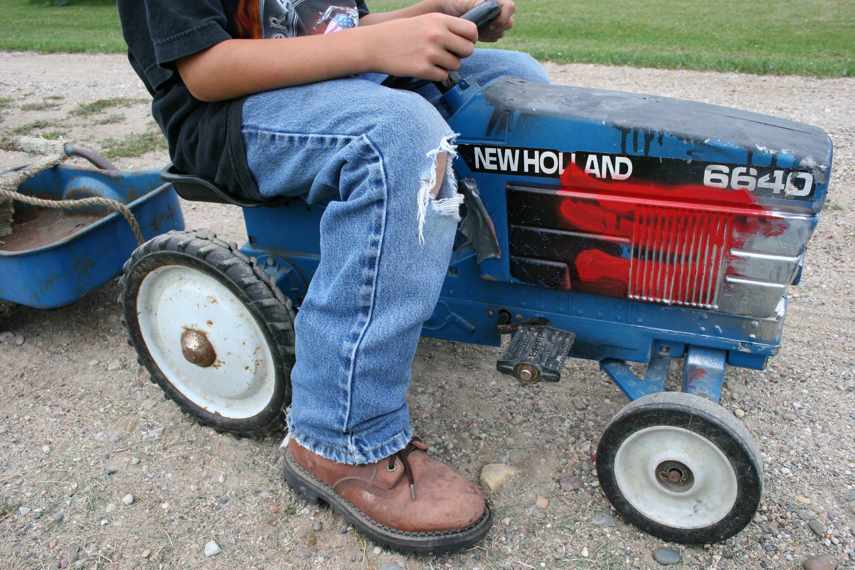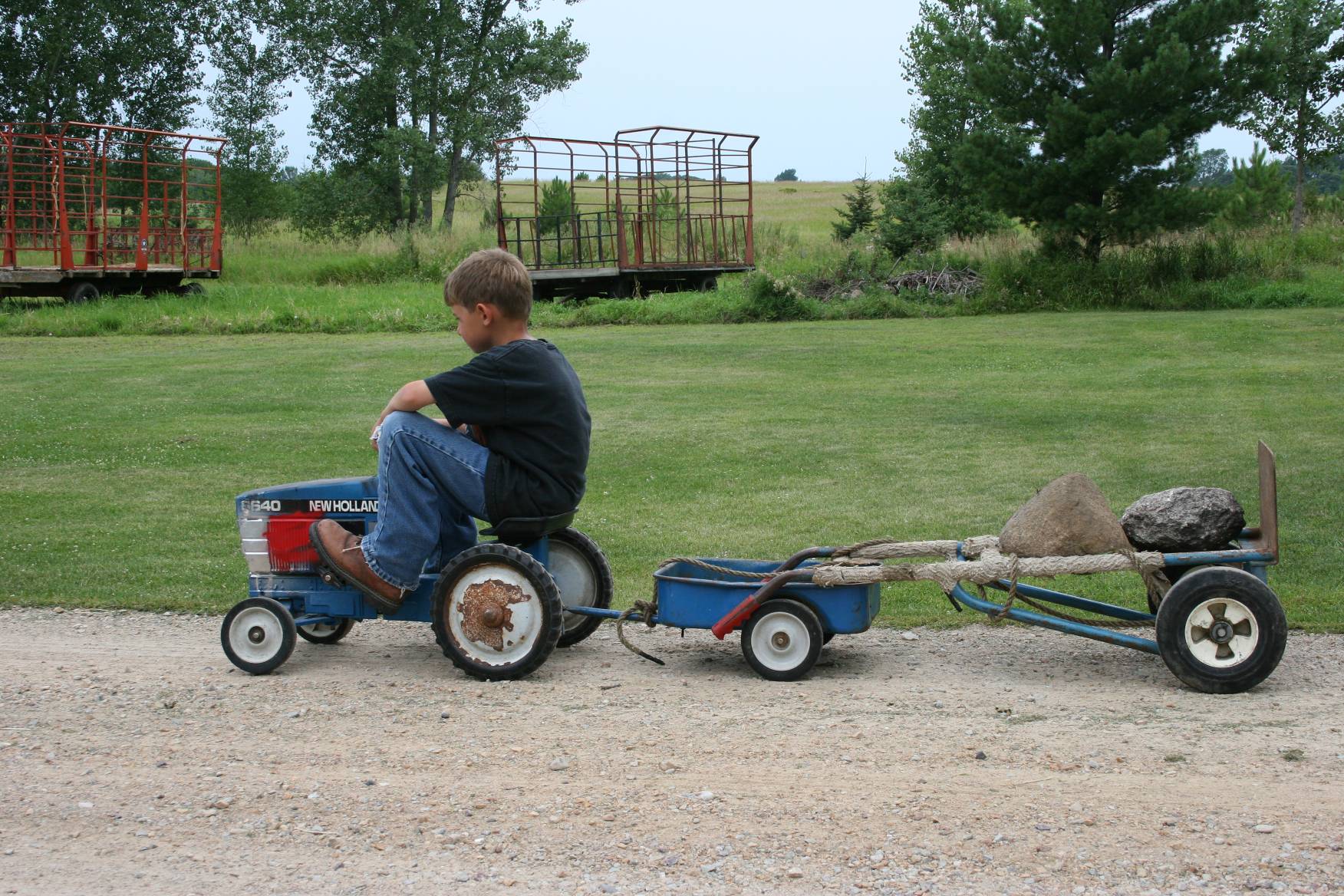 And then I ask Jayton to demonstrate his pedal tractor pulling skills. He and Jarett pile two hefty rocks onto a trailer and Jayton straddles the miniature tractor that he’s outgrown. Last year he earned a second place trophy in a local competition.