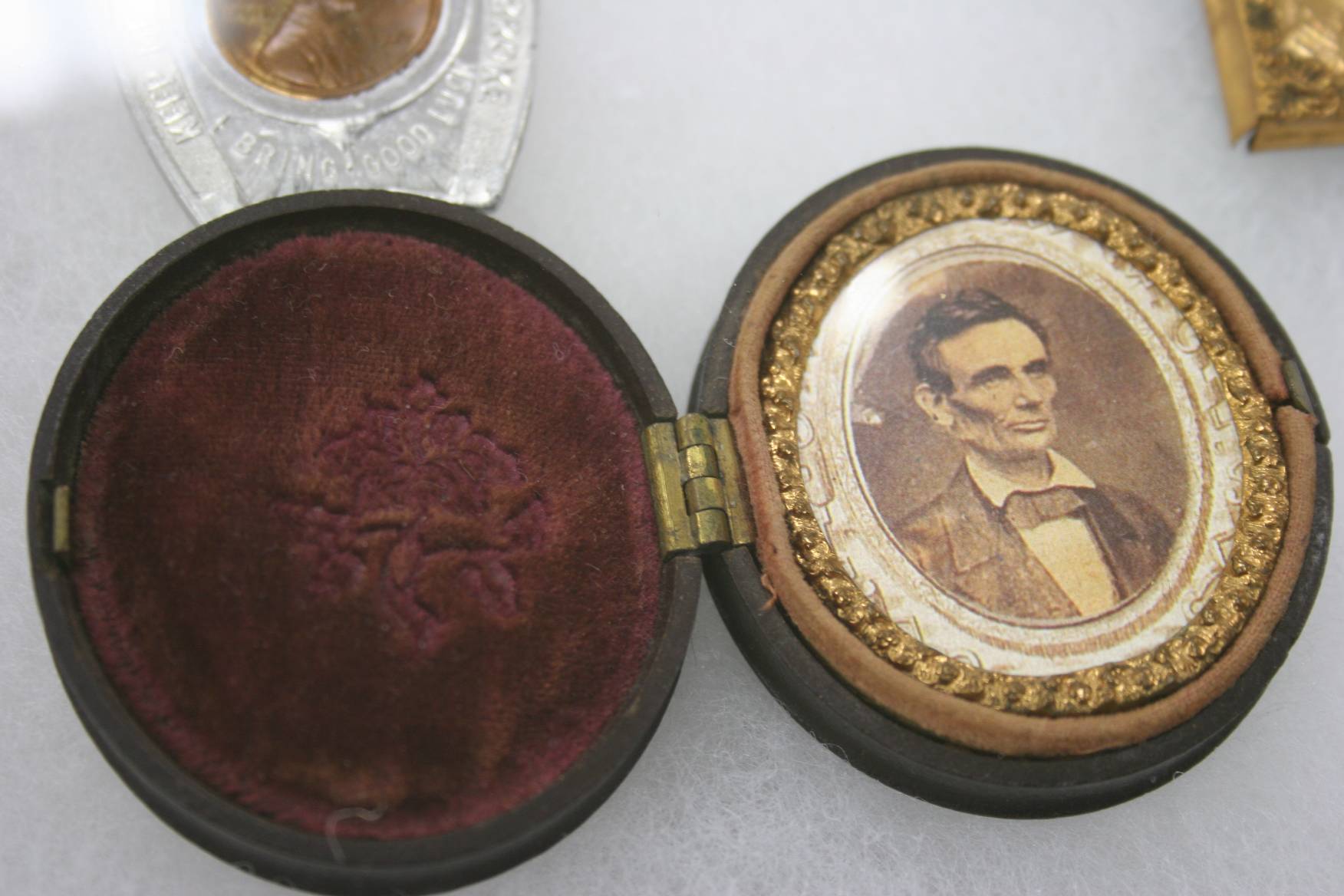 The evening’s presenter, however, left the slave documents at home. I am disappointed. But only momentarily. He brings instead a whole tote full of interesting Lincoln-related memorabilia.