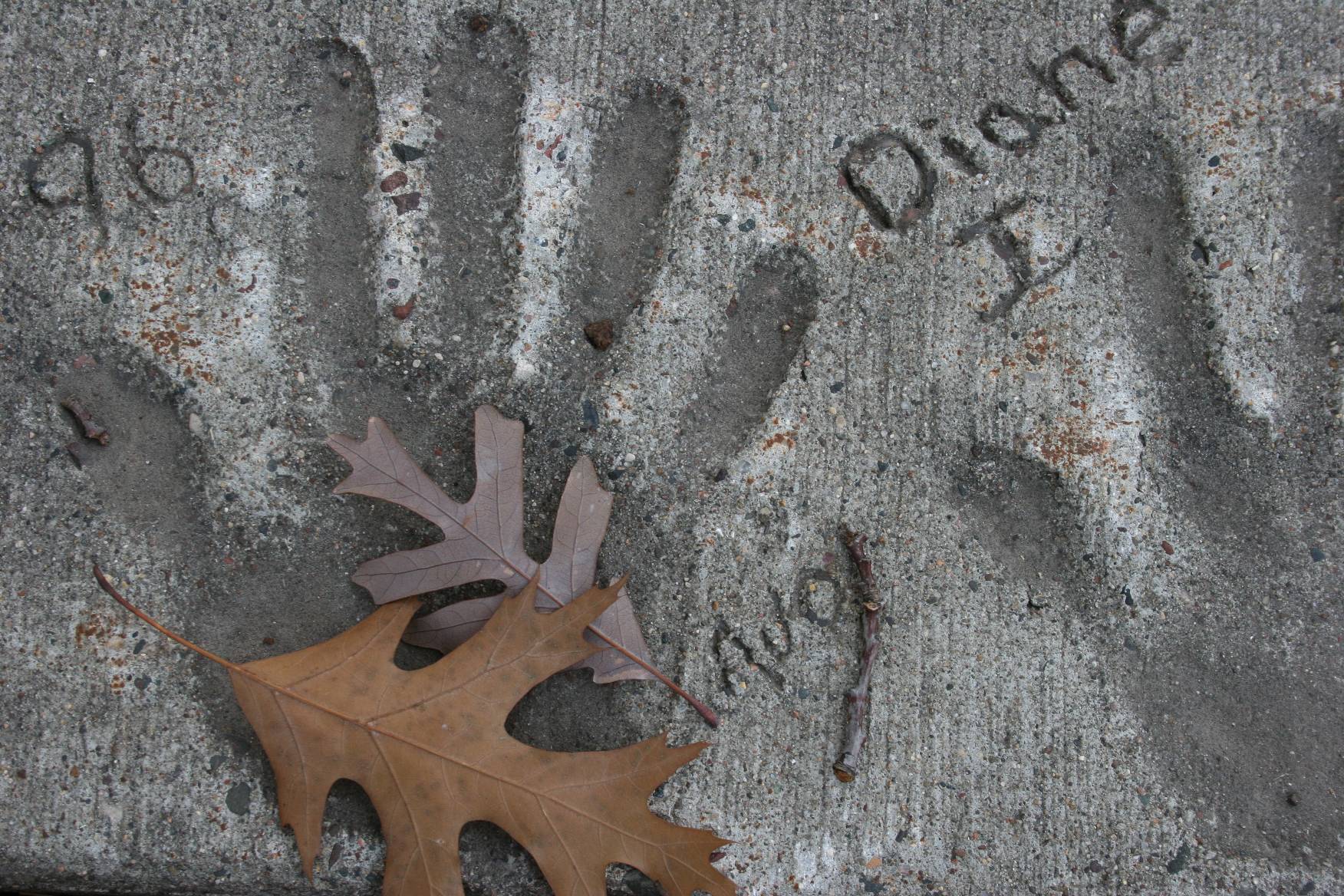 When I step from the van, I notice something I have not previously seen. How could I have missed the handprints? But they are here, a long row of handprints embedded curbside in the cement. These have nothing to do with the fest, but I pause before aiming toward the scarecrows.