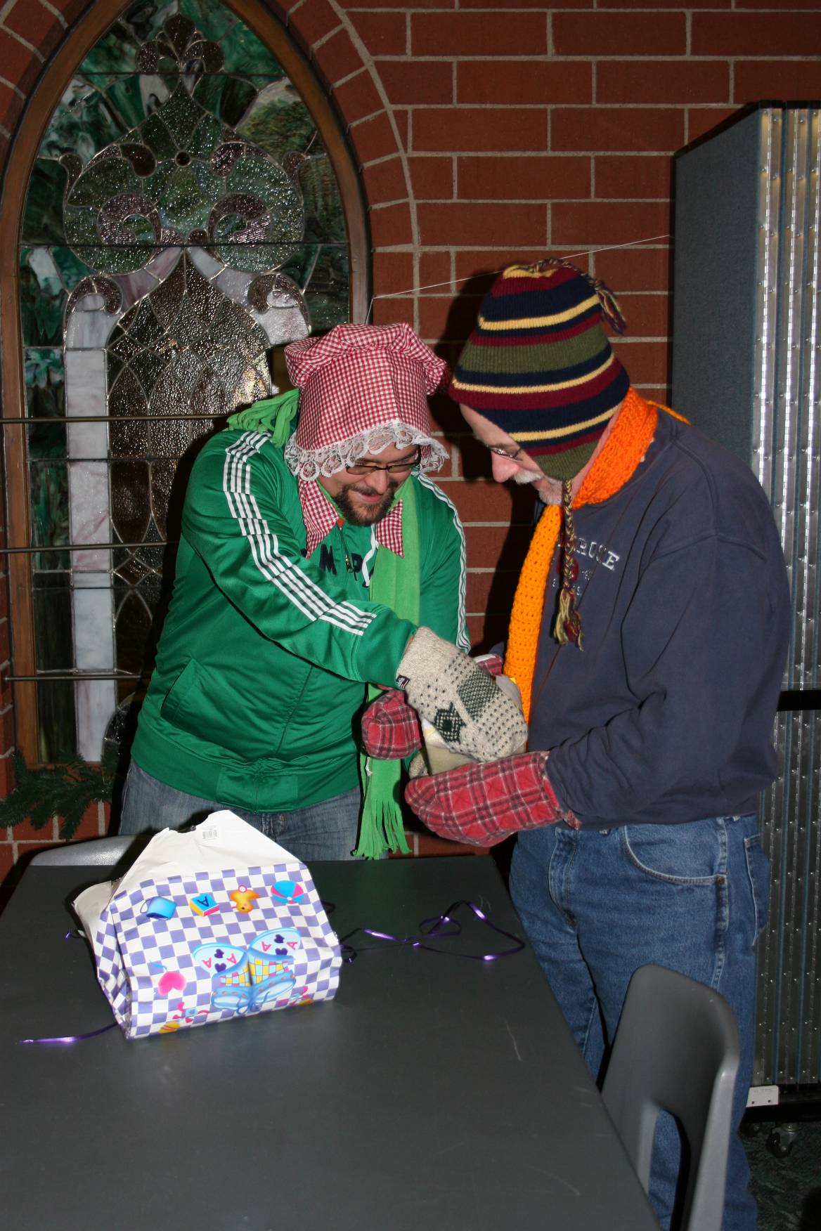 Two men, dressed as Laura Ingalls Wilder and Heidi (from Johanna Spyri's book) and who shall remain anonymous, vie to unwrap a gift.
