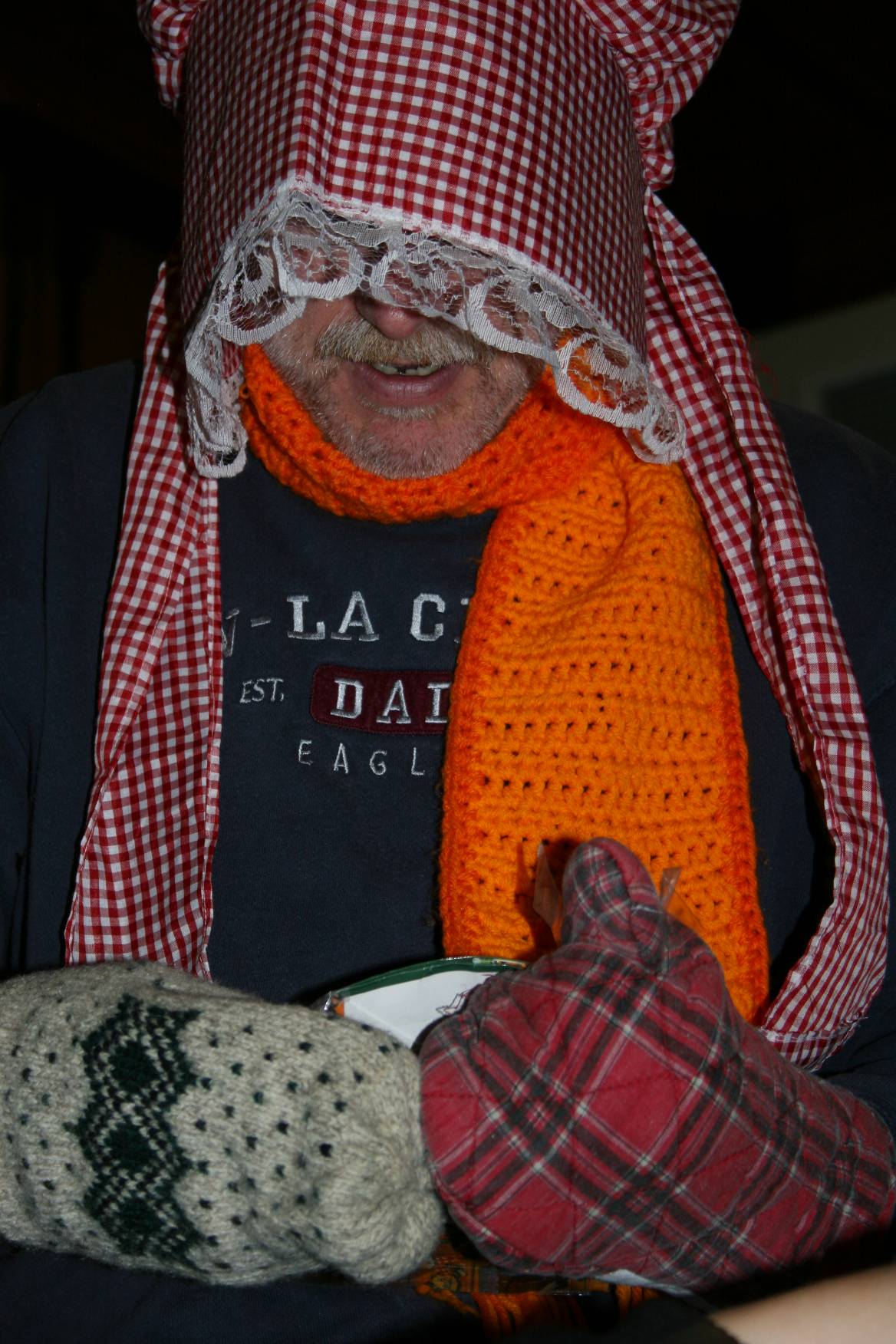Soon we were all laughing and shouting encouragement and laughing some more. There’s something about a bearded man in a gingham bonnet that’s just downright amusing. Maybe you had to be there. There’s also something incredibly hilarious about a friend suddenly transformed into a Dr. Seuss-like character by a neon orange hat.