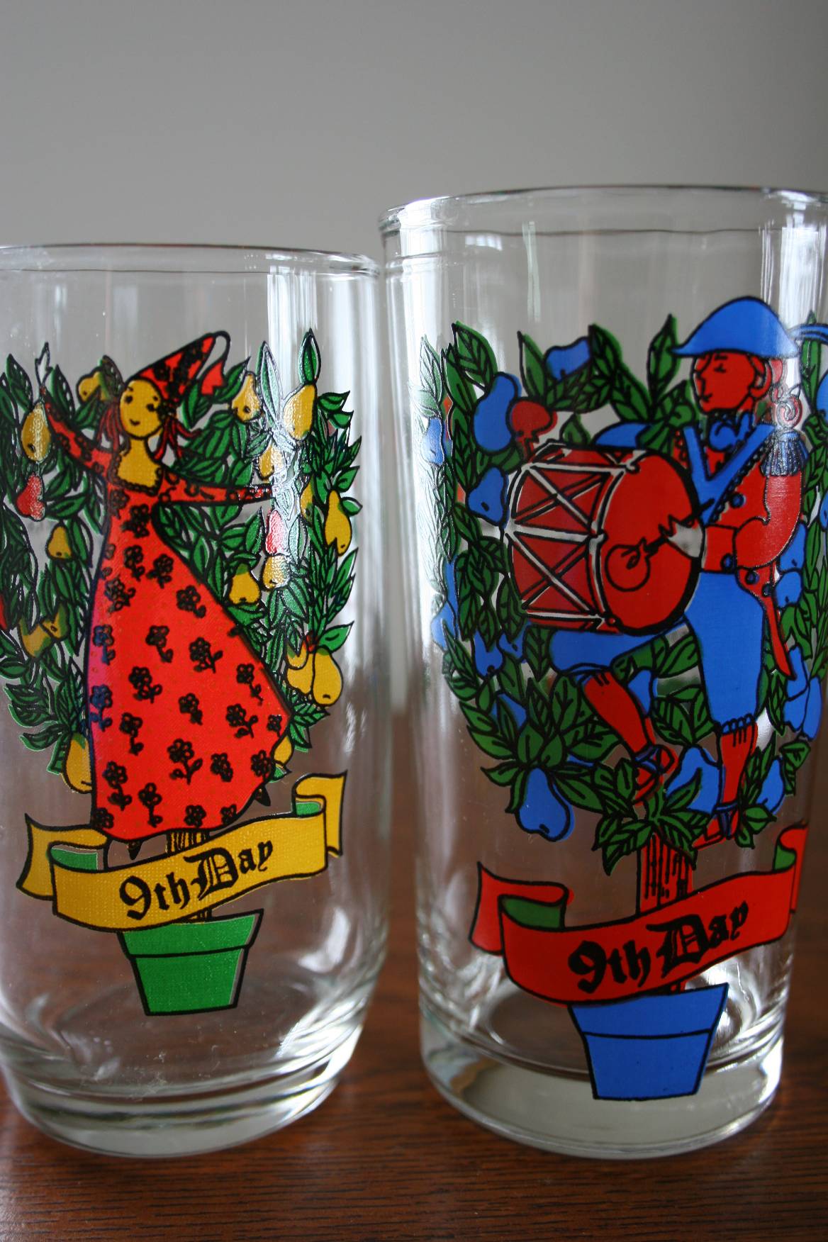 A dancing lady is printed correctly on the drinking glass to the left for the ninth day of Christmas. The glass to the right is wrong with a drummer depicted on the ninth day.