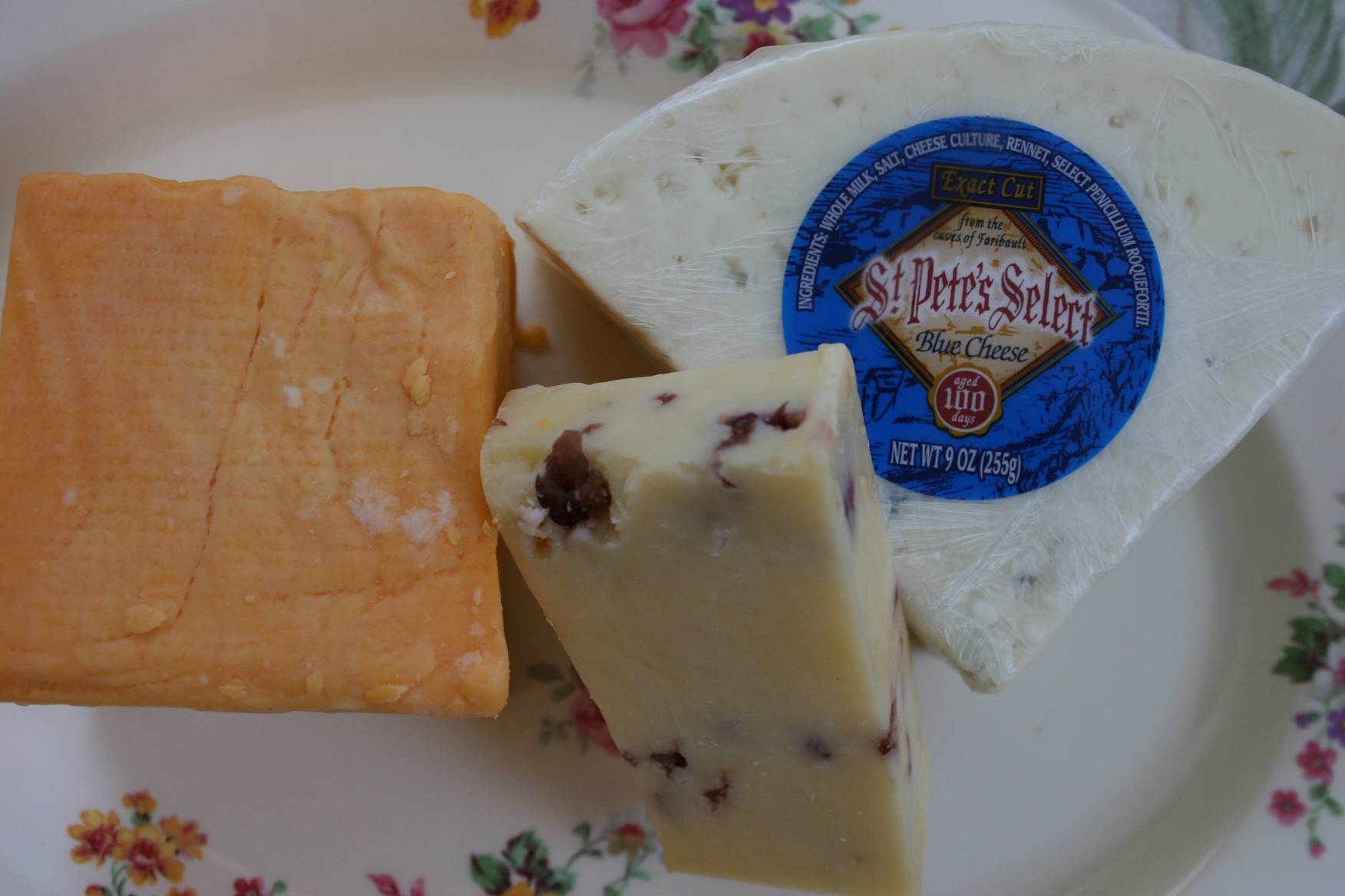 Cheeses I purchased recently at The Cheese Cave, left to right, Cheddar blue, White Cheddar Cranberry and St. Pete's Select Blue Cheese.