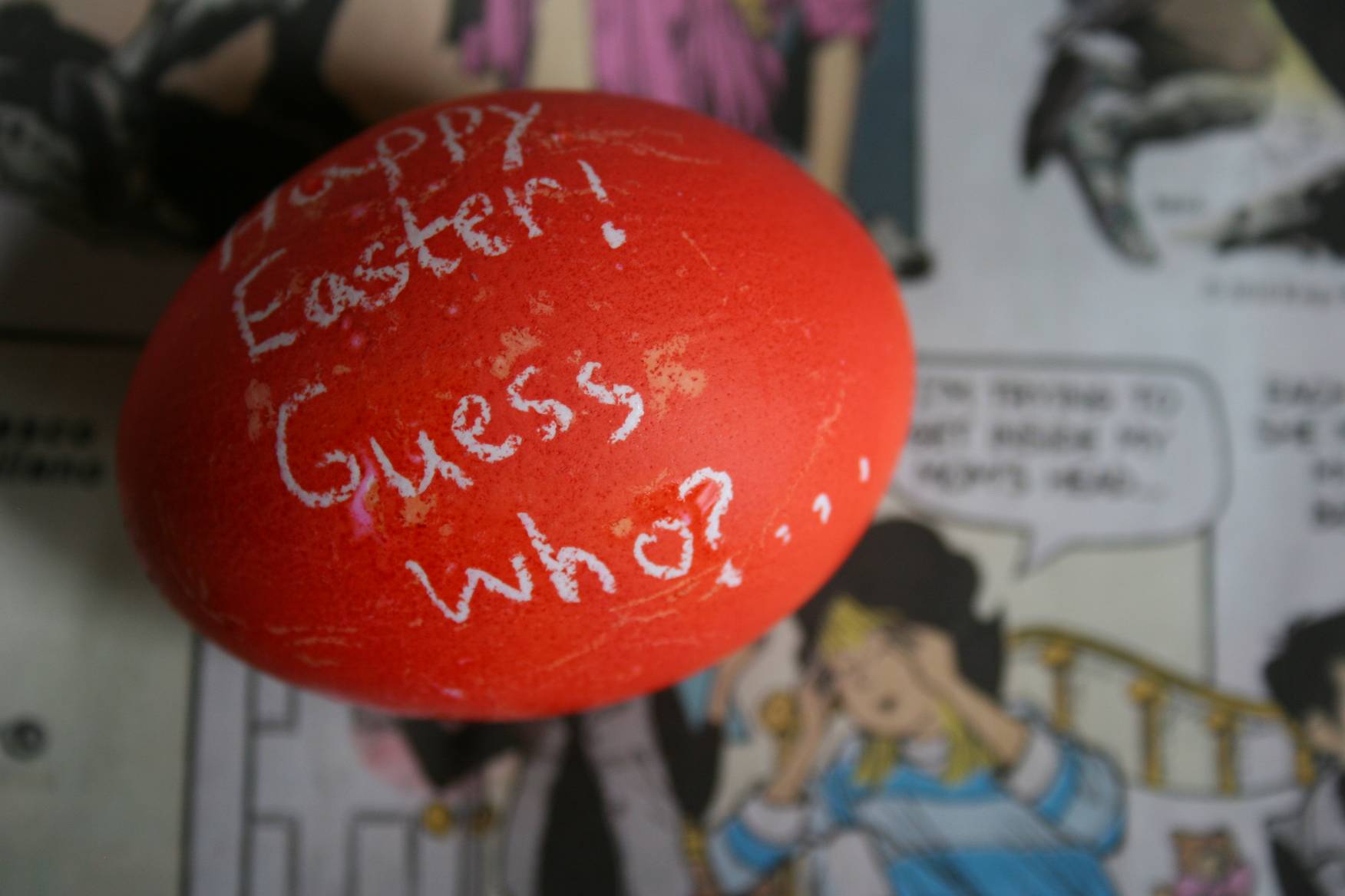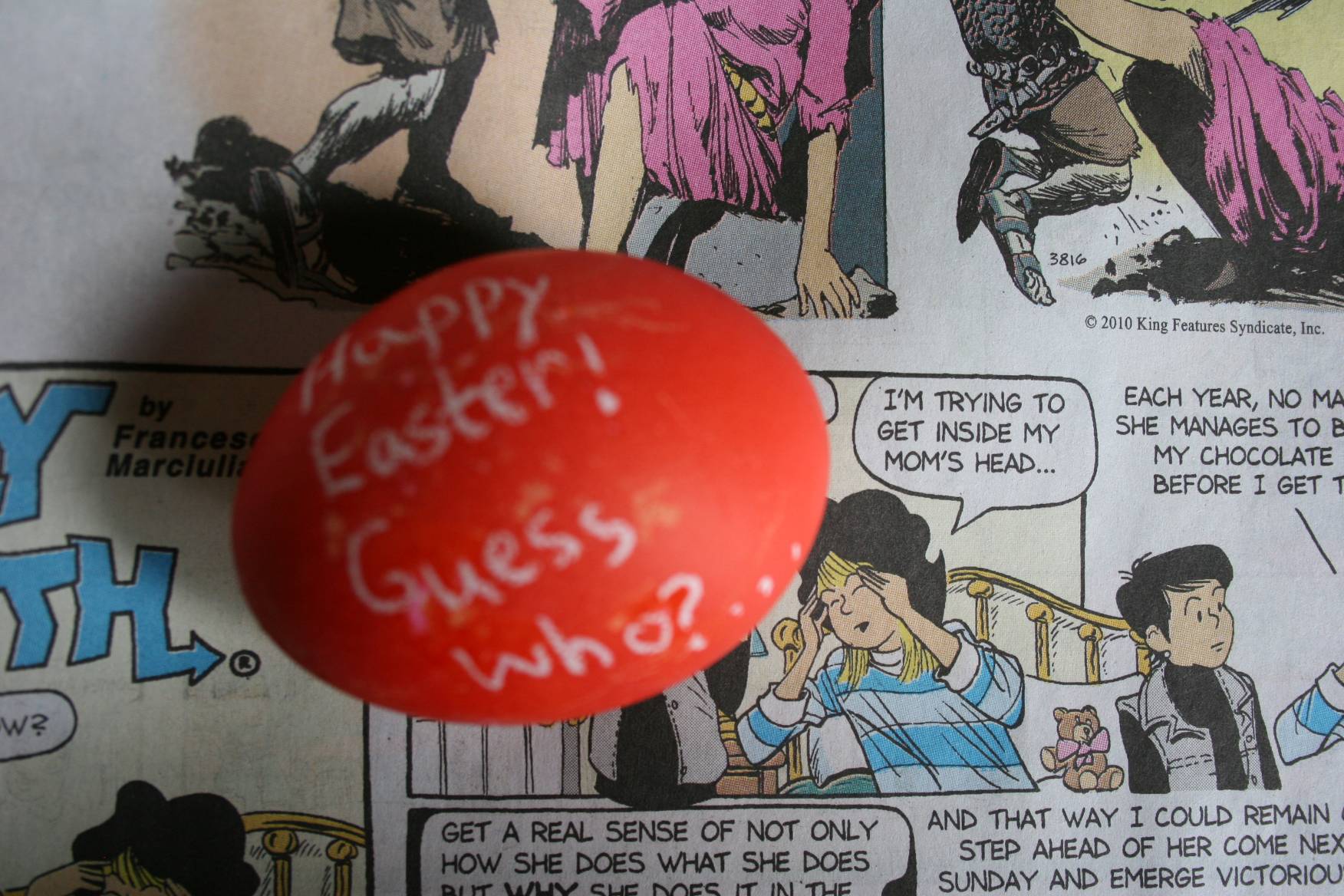 I lay the “Happy Easter! Guess who?” egg down atop the comic strip, next to this text: