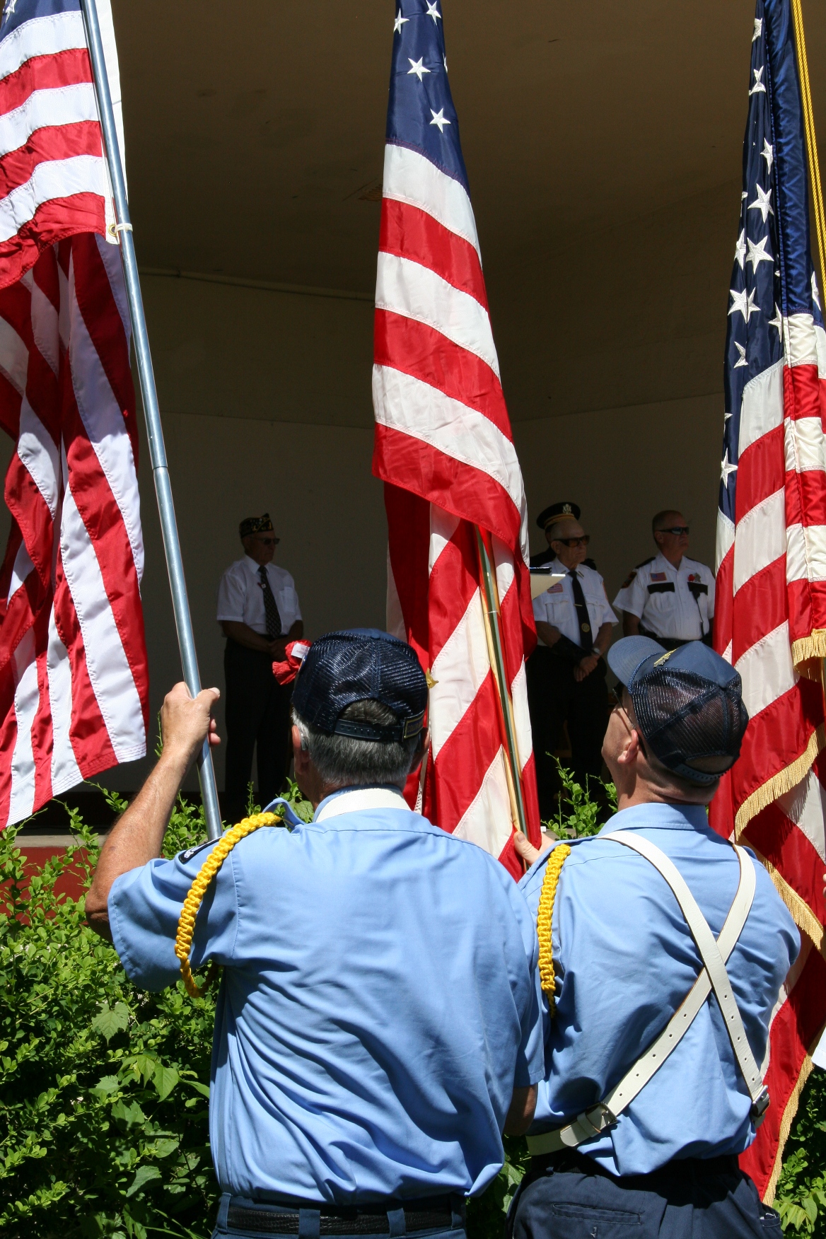 The Rice County Veterans Association Honor Guard/Color Guard awaits the start of a Memorial Day program, where memorial wreaths will later be placed upon the white cross seen here in the center of this photo.