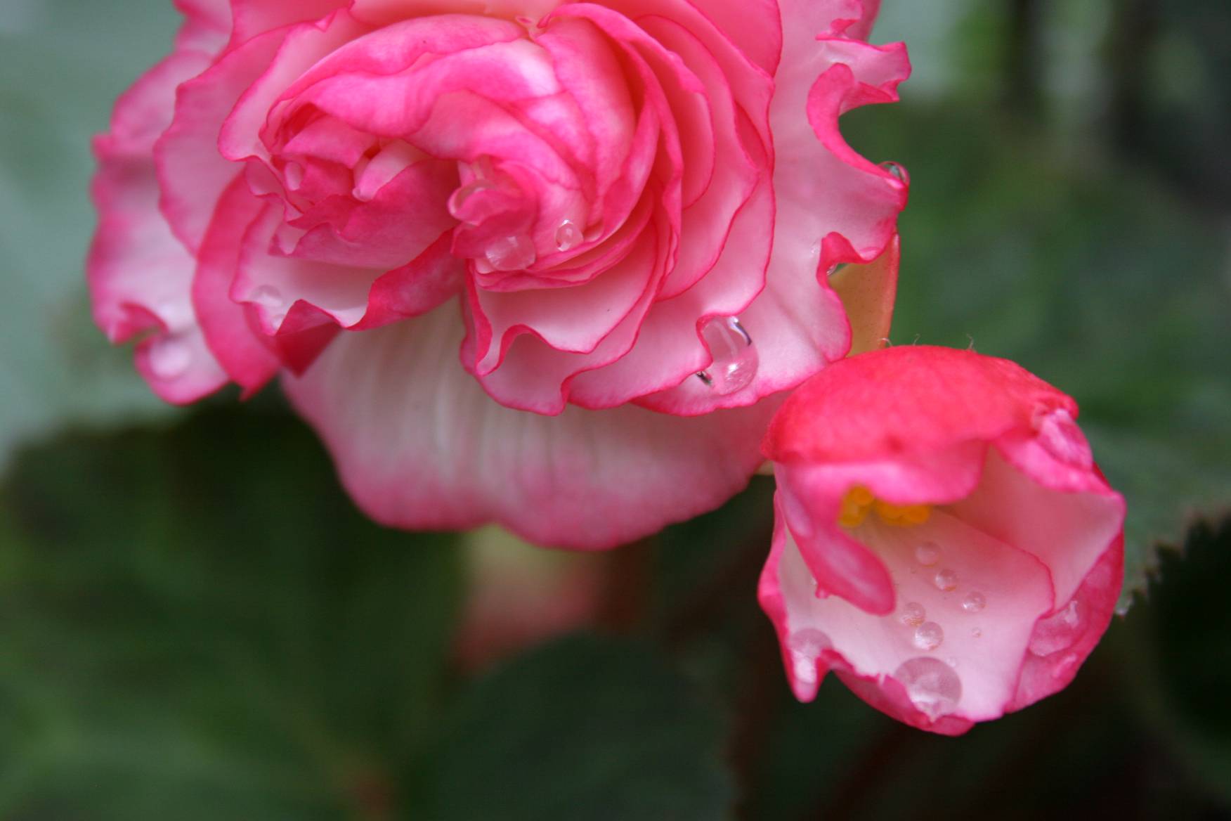 So late Thursday afternoon, when the lighting was perfect, the rain no longer falling, I grabbed my camera and headed outdoors. I didn’t have to walk far before I noticed glistening raindrops clinging to begonia blossoms in a pot next to the garage.