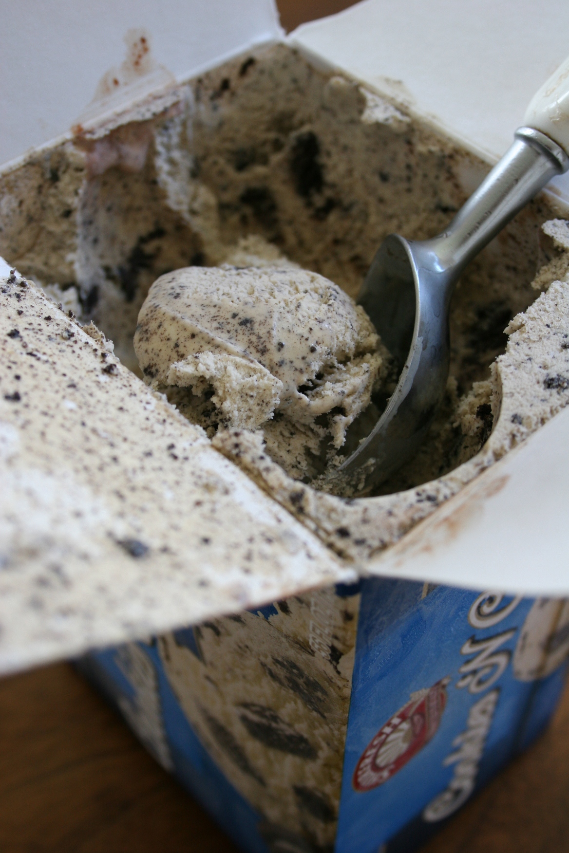 Next, I lift the flaps on the Cookies ‘N Cream box, edging the tip of the ice cream scoop into the hard, hard ice cream.