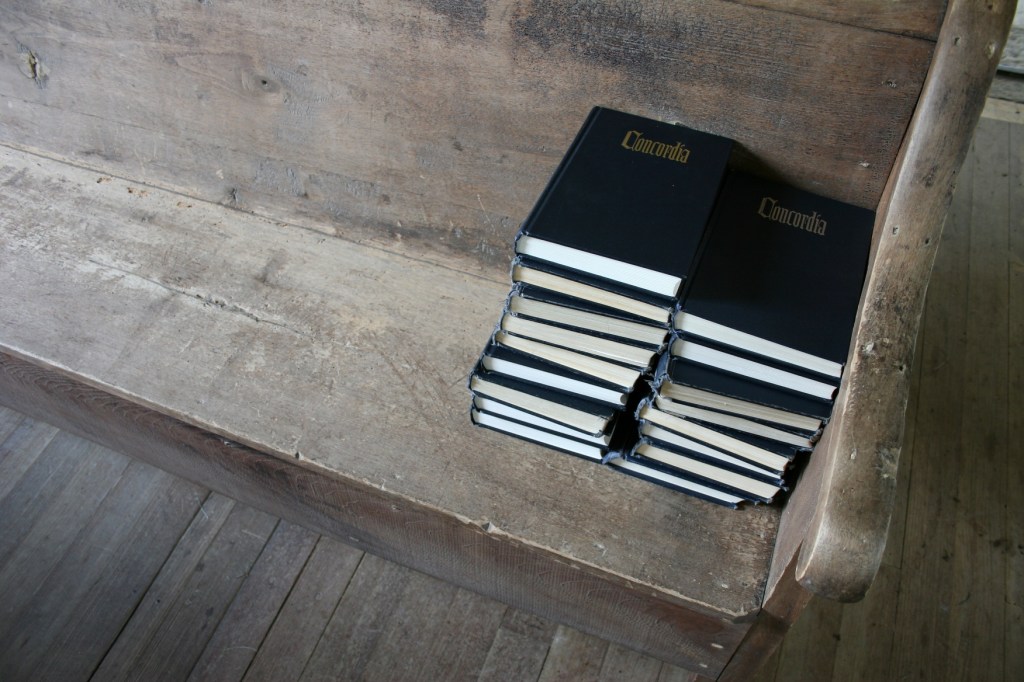 Rugged pews and rustic wood floors remind worshipers of bygone years. Copies of The Concordia Hymnal, piled on a pew, date to 1967.
