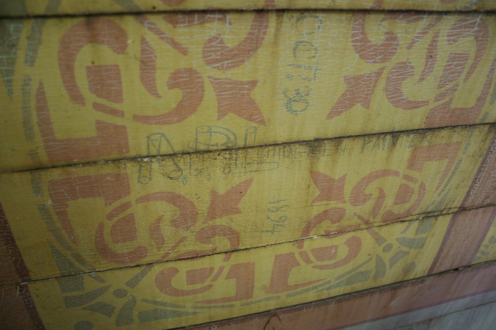 In the balcony, historian Bob Dyrdahl shows me this treasure, the dated (October 30, 1894) signature of A. P. Lindgren who painted stars upon the ceiling edged by a stenciled border. His work also graces other sections of the sanctuary, along the stairway, for example.