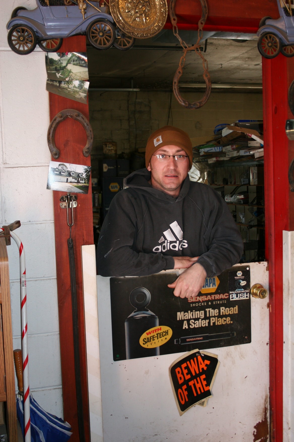 Louie Kukacka, leaning on the half-door between the garage bay and the office, speaks his mind about America and independent businessmen.