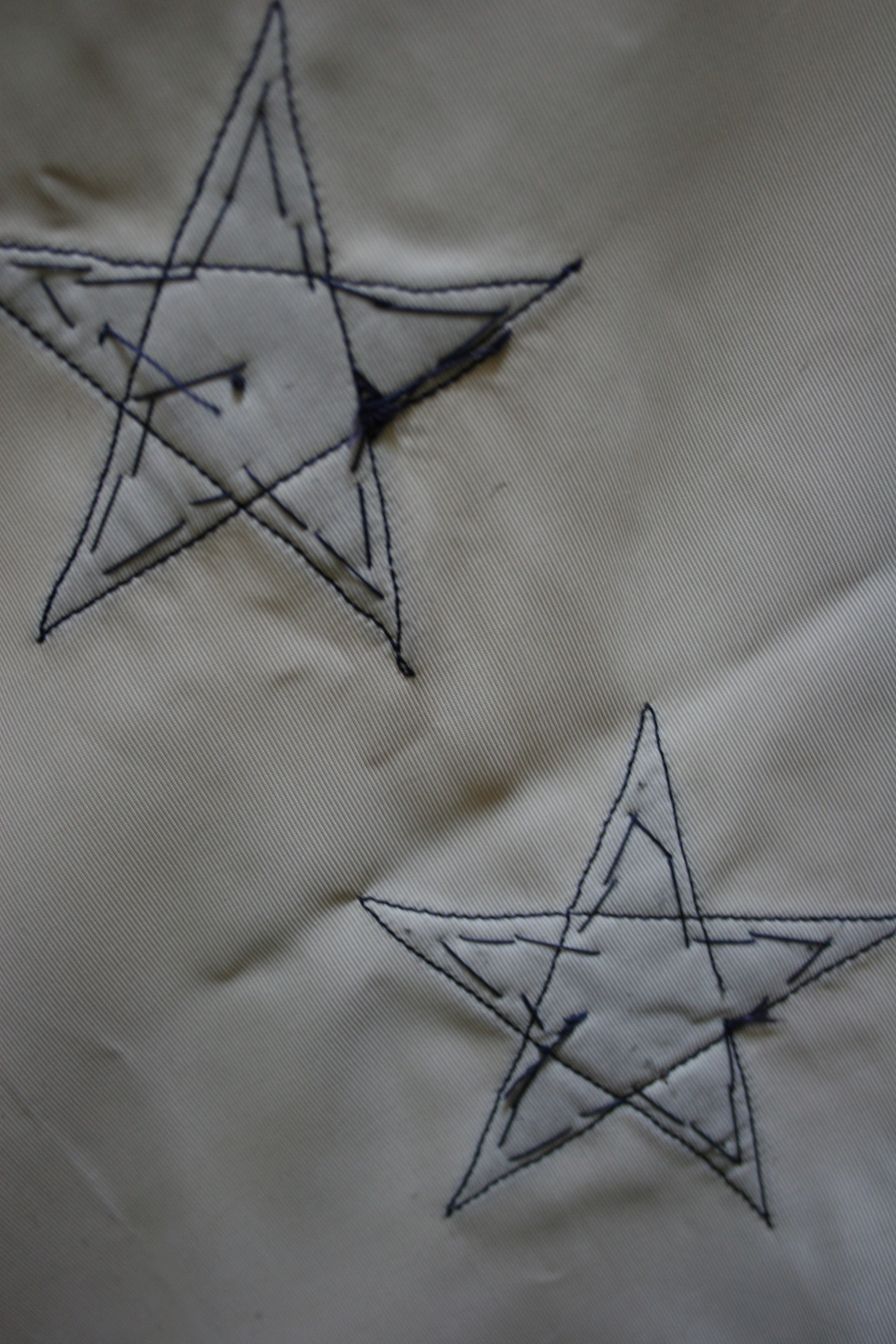 Hand-stitching on the backs of two gold stars honoring those who died. The outer row is machine-stitching, holding the blue stars in place.