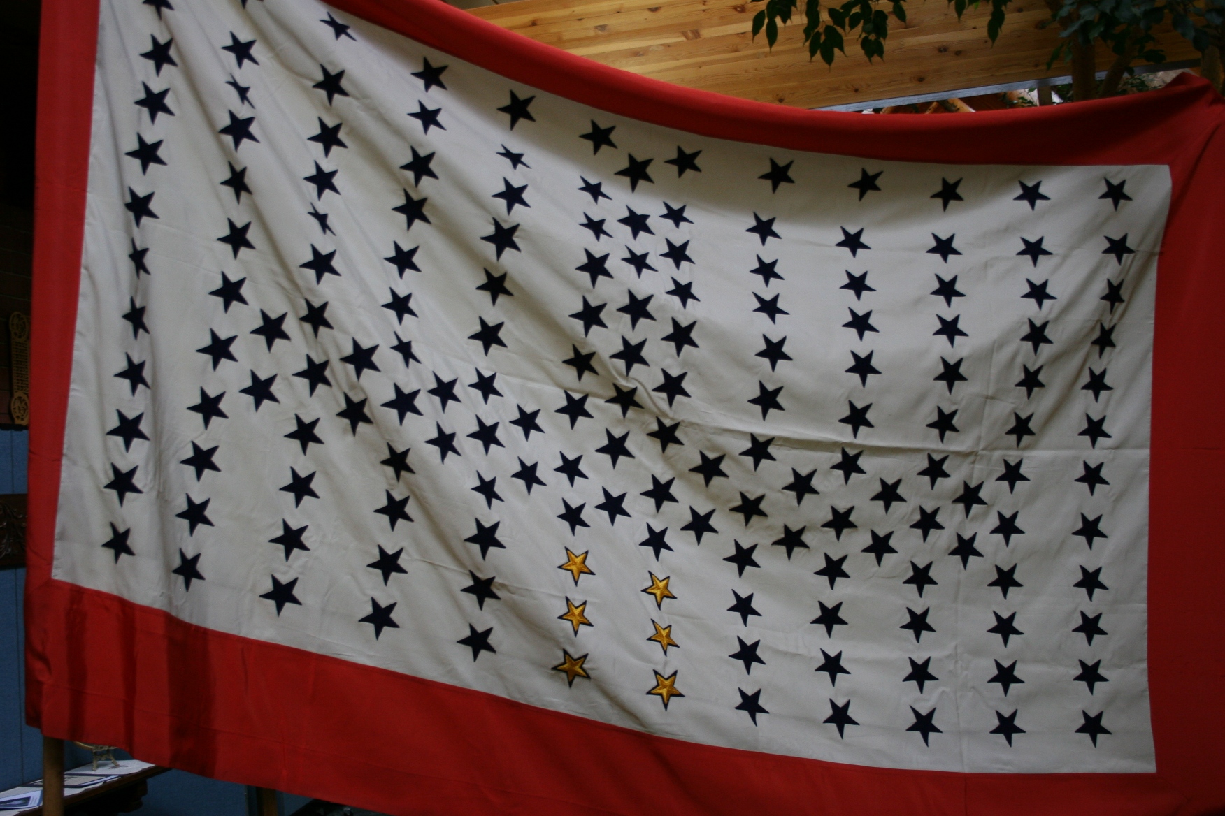 The one flag, with the big blue star in the center and the smaller white stars along the sides belongs to Kathy, who manages the church office. She knows nothing about its background, only that she purchased and proudly flies this red-white-and-blue at her home along with an American flag.