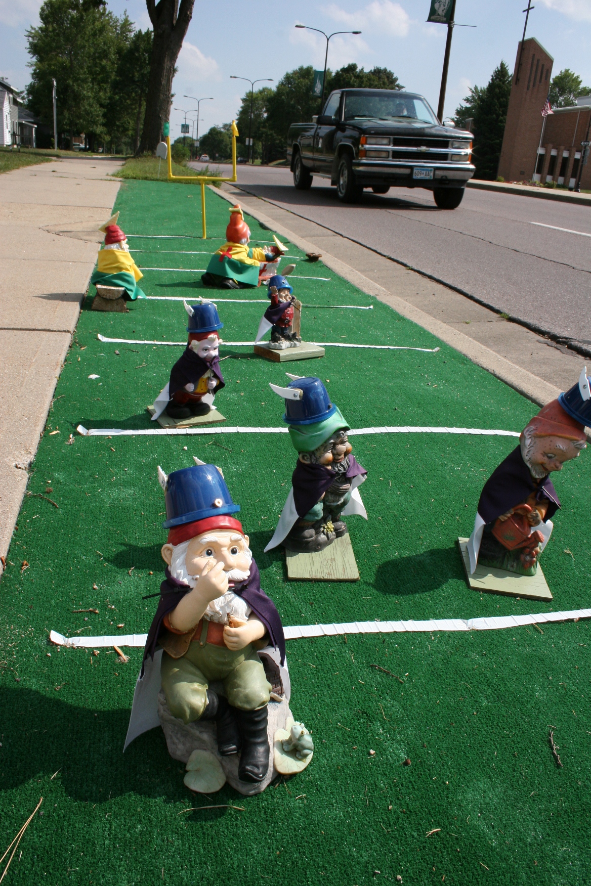 I see a few tackled, injured, or maybe just wind-blown, Packers lying on the turf. A medic is even carting one off the field. I wonder if, occasionally, a Wisconsinite walks by and covertly knocks over a Vikings gnome. Come to think of it, I didn’t check to see if the football players are secured in place.