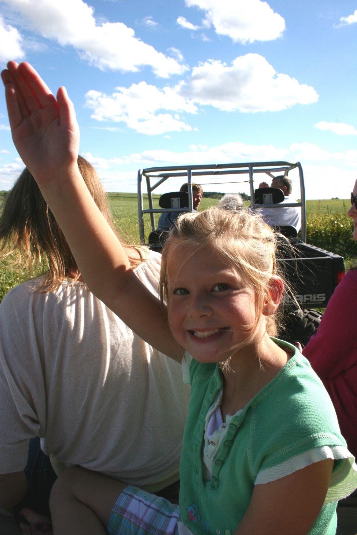 Off we went, bouncing along the field road under a beautiful blue sky scuttled with white clouds. Honestly, September days in Minnesota don’t get much better than this—sunshine and soybean fields, country air and spacious skies, princess waves and smiles as wide as the horizon, dog hugs and happy kids, laughter and the love of family, my family.