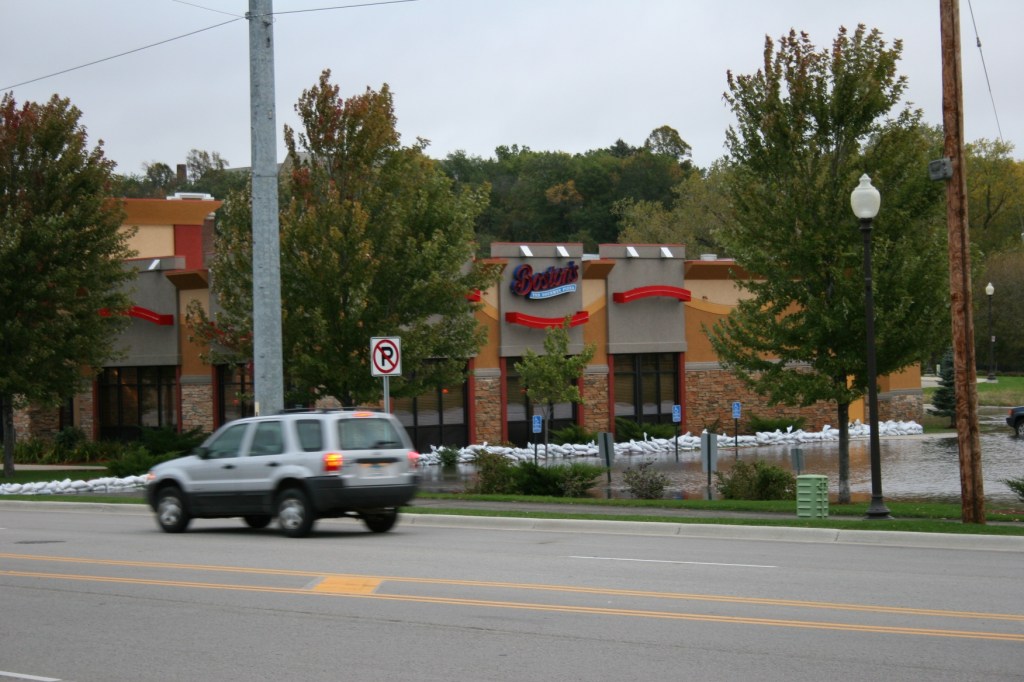 Crews have sandbagged Boston’s Restaurant along Minnesota Highway 60. The parking lot is under water.