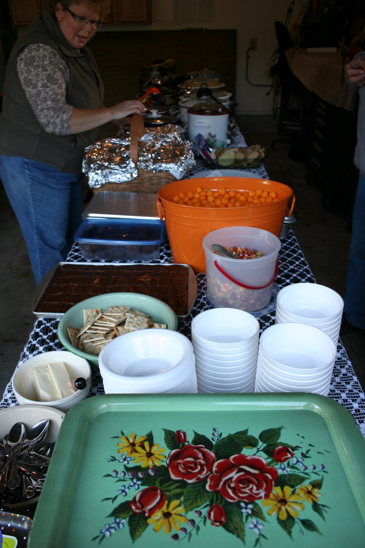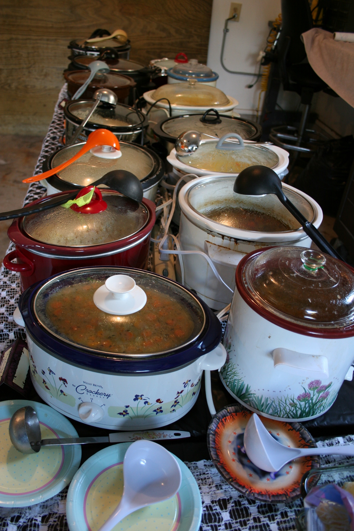 We place our containers of soup on banquet tables set up in the garage and plug the crocks into outlet strips. An extension cord snakes to the next-door neighbor’s house so there are no blown circuits.