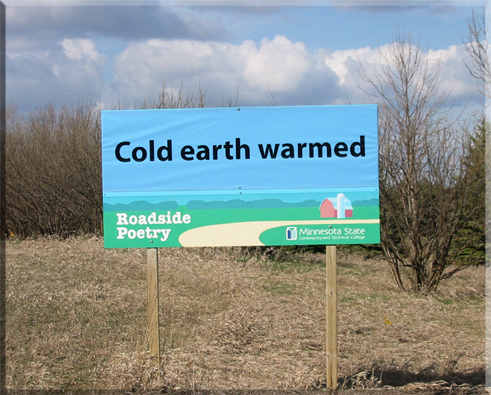 In Fergus Falls, the Fergus Area College Foundation sponsors a seasonal poetry contest and posts the winning poem on four Burma Shave style billboards. I won the spring Roadside Poetry Project competition. (Click here to read a story published today in The Marshall Independent about my writing and my Roadside Poetry poem.)