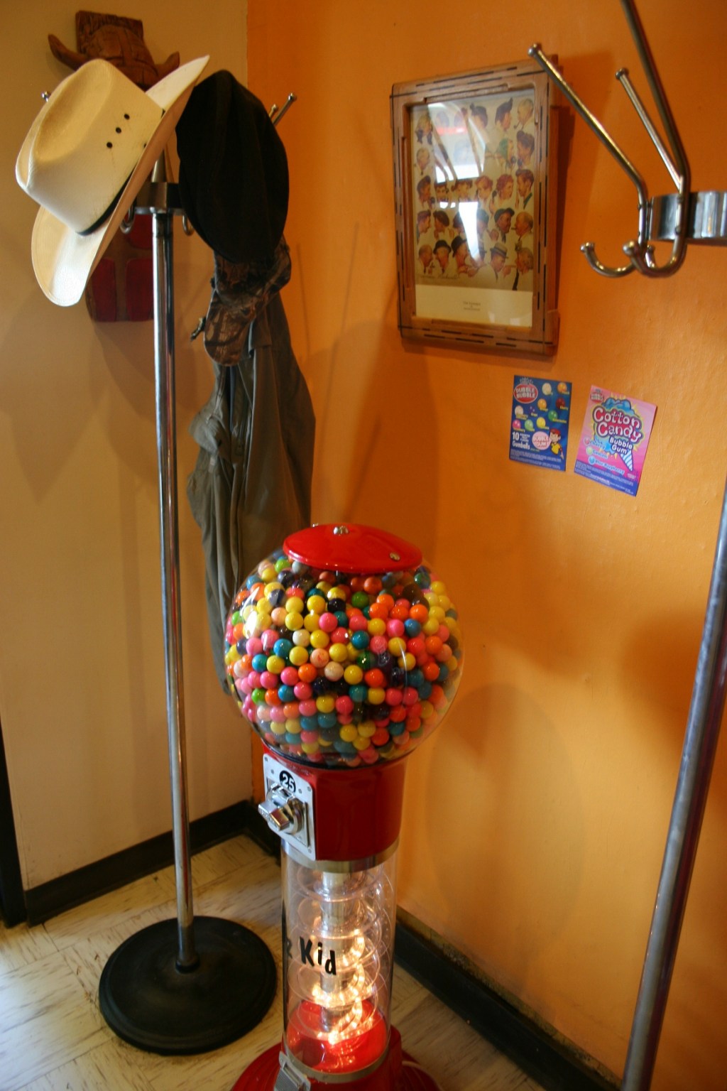 A Norman Rockwell print hangs on the wall by the coat racks and bubble gum machine.