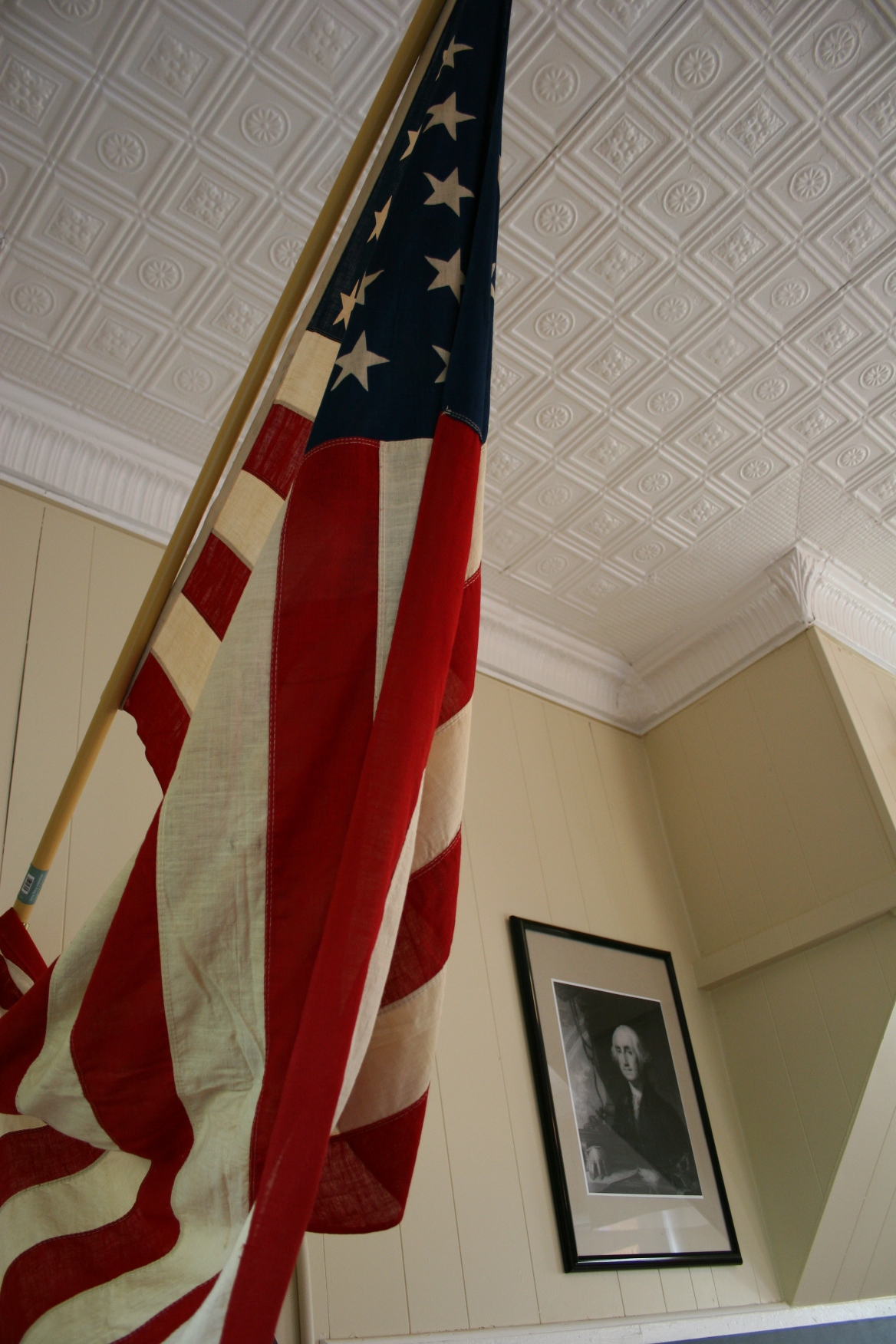 A flag and portrait of George Washington at the former District 20 Millersburg School, now a museum.