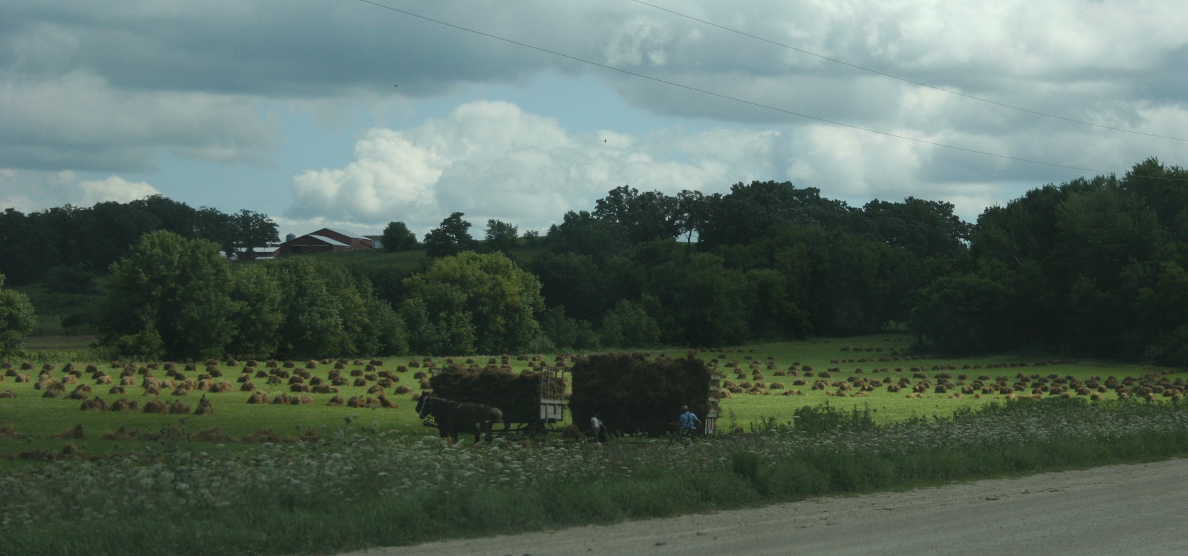 And so we drove on, further south and then west past several Amish farms—past the horses and wagons, the laundry on clotheslines, the shocks in fields and the Amish men throwing bundles high atop a wagon, their arm muscles bulging from seasons of labor.