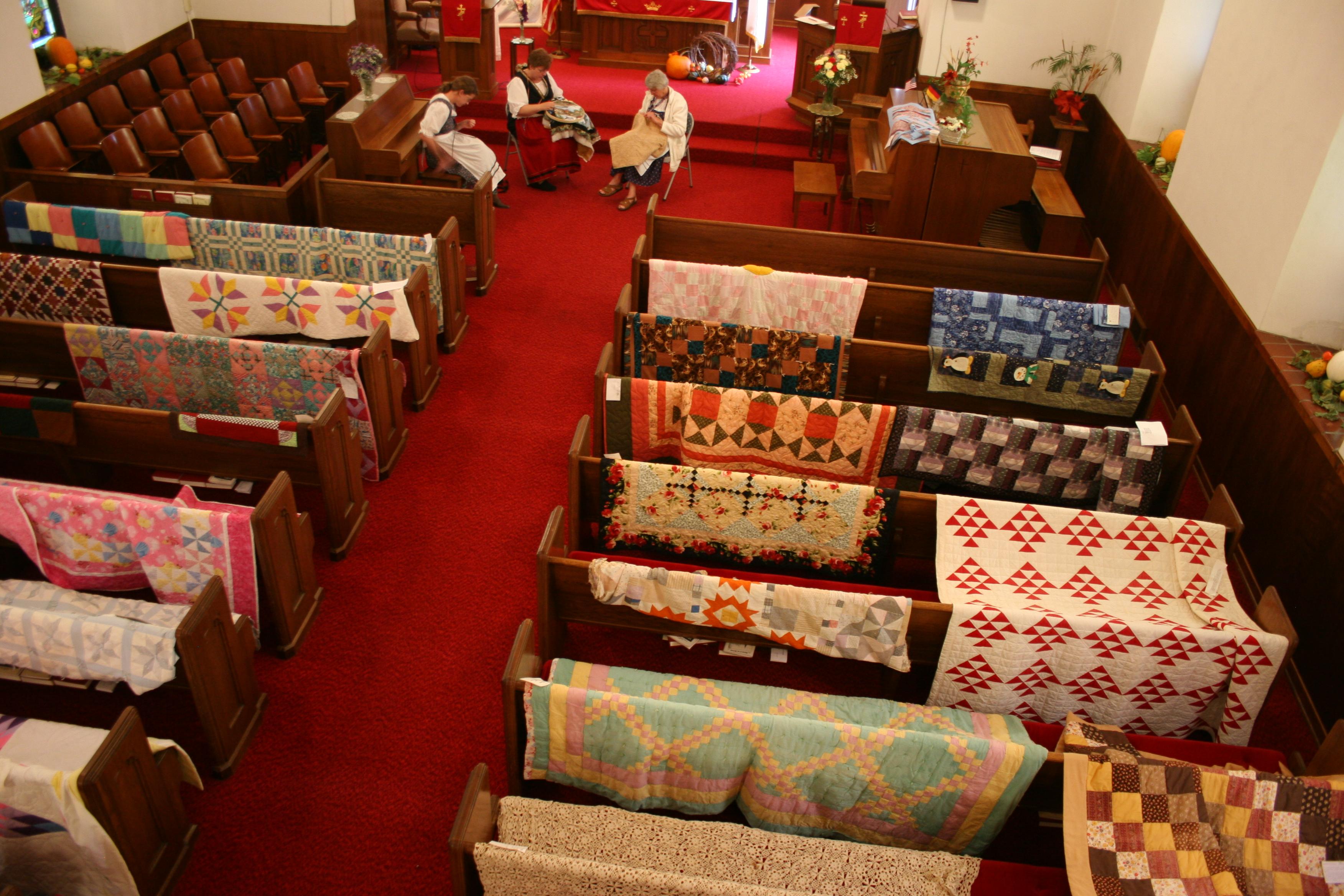 Inside St. John's sanctuary, homemade quilts blanketed the pews. They were not for sale. Each church family was asked to bring a quilt for display along with the story behind it. Up front, three women demonstrated stitching techniques.