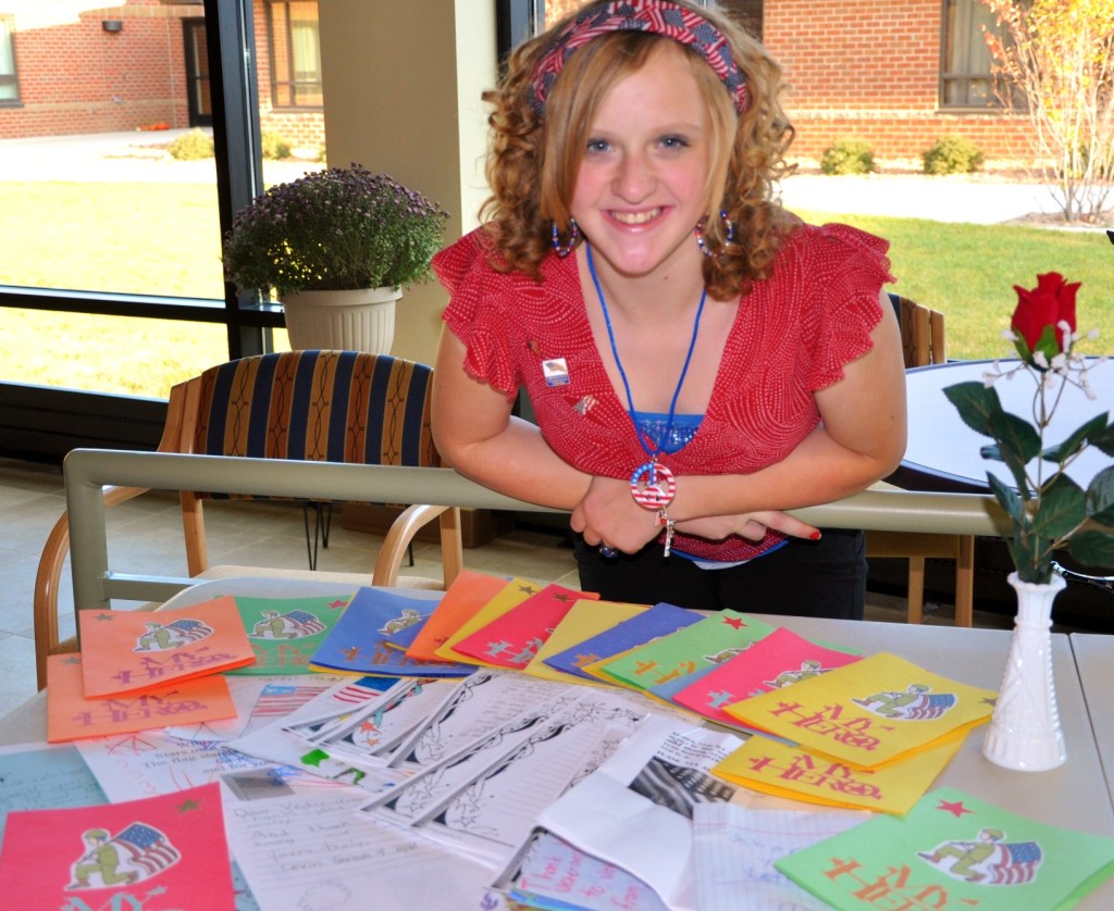 Her passion for honoring our veterans doesn’t stop with Veterans Day. Says Heather’s mom: “…she collects messages all year round online and in person, gives speeches about her cause, promotes Project New Hope (providing veteran family retreats), makes quilts for Quilts of Valor, visits the vets home all year round, involves the school in Holiday Mail for Heroes and is working on care packages for soldiers…just to name a few things.”