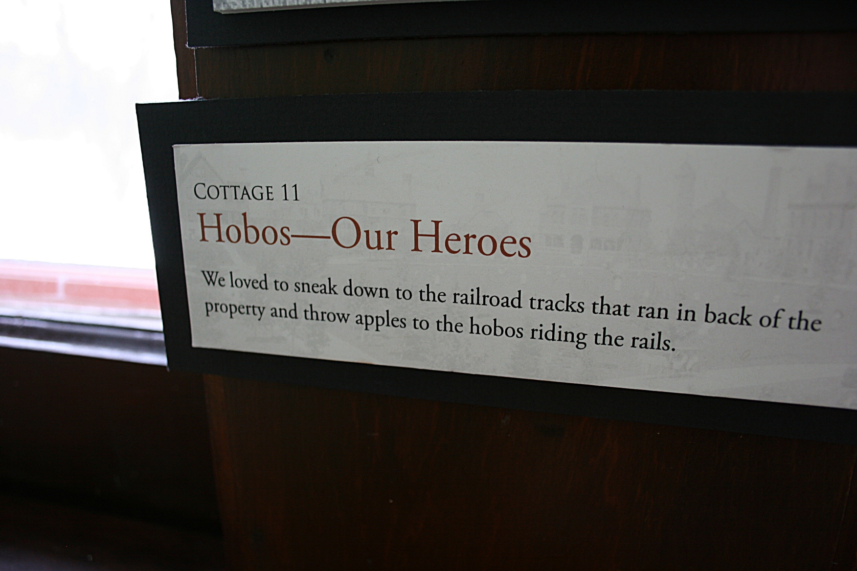 A sign on a stairway landing tells visitors about the boys' dreams of escaping via rail and of their admiration for hobos. Some boys did hop trains and ran away.