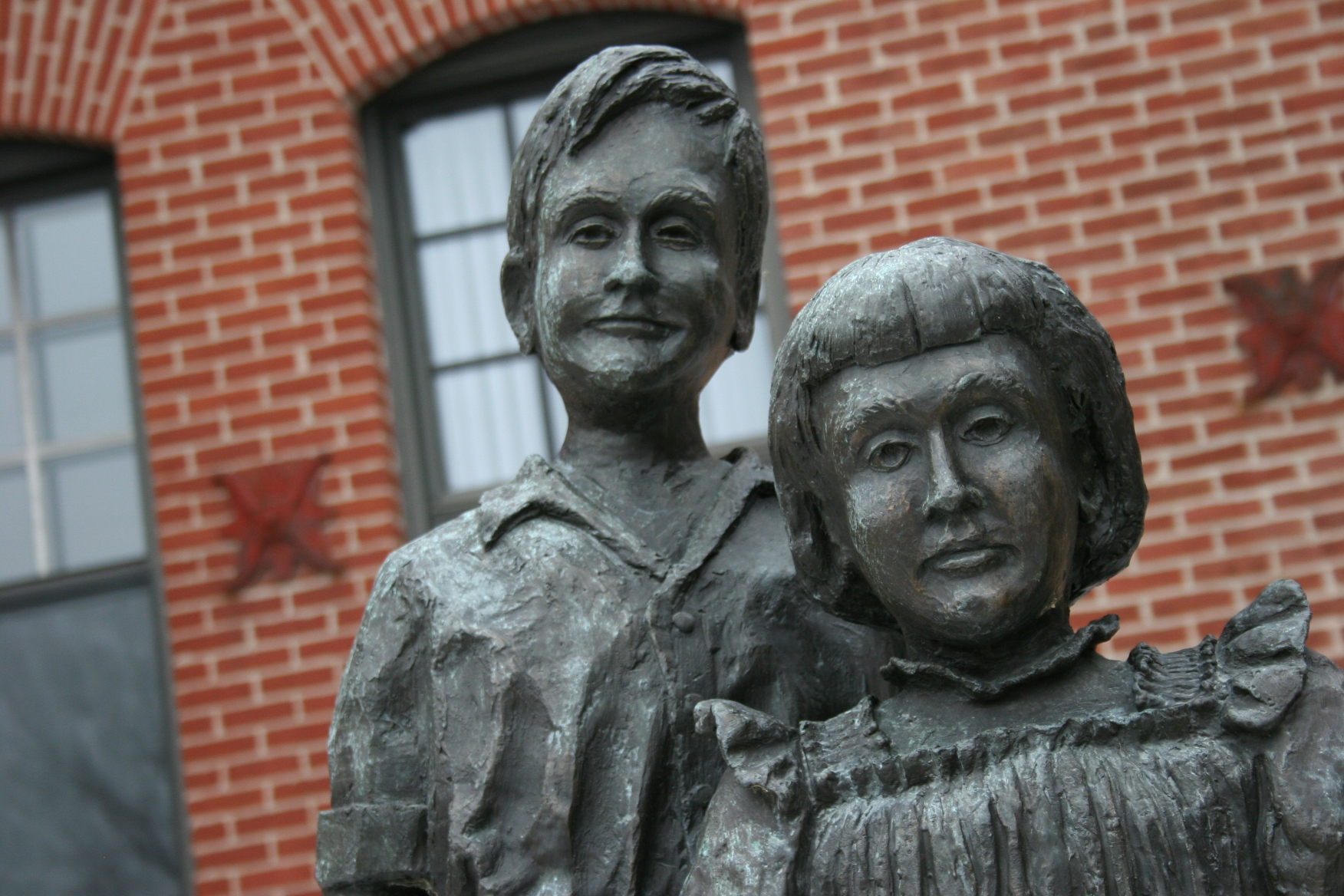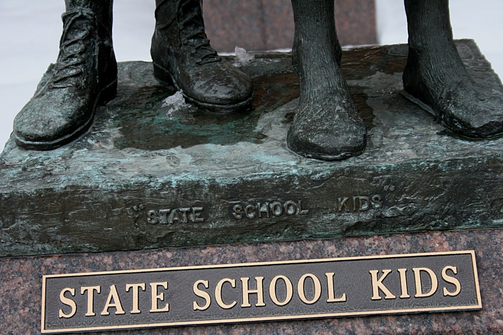 The "State School Kids" memorial stands in front of the main building and was dedicated in 1993.