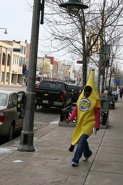 Walking in historic downtown Appleton, I saw not a cheesehead, but this banana, who later posed for a photo. However, I prefer the action photo to the posed. She was promoting the Tropical Smoothie Cafe. My daughter was hoping we would also spot a gorilla pushing balloons along another Appleton street. But, alas, the gorilla was nowhere to be seen.