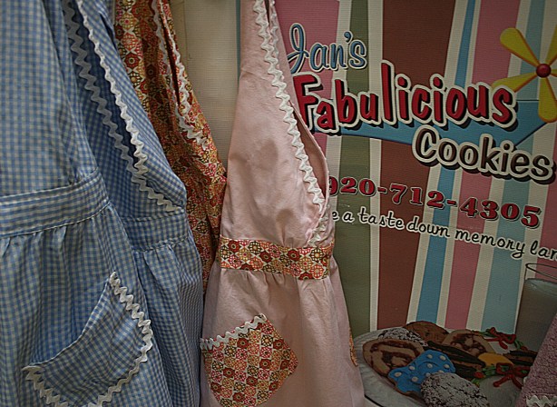 When I shop at farmers' markets, I pay attention to details like merchandise display. Jan Jourdan's vintage marketing theme drew me right over to sample her Jan's Fabulicious Cookies. I asked to try the gingersnaps. Ooops. Not gingersnaps, but molasses cookies. Thick and chewy, they were as advertised, "fabulicious." Love those aprons, too. If my daughter hadn't just given me one for Christmas...