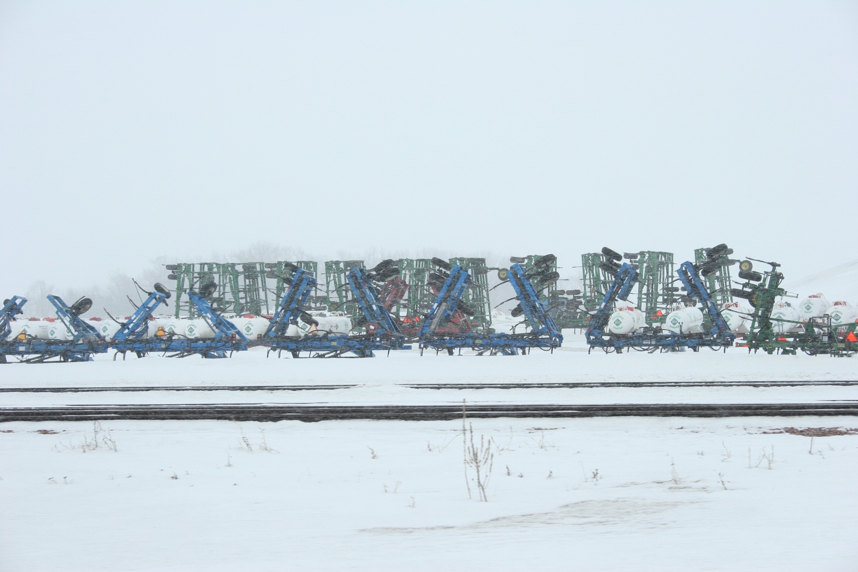 Railroad tracks and diggers slice precise horizontal lines across the landscape in this March 2011 image shot while traveling U.S. Highway 14 between Springfield and Sleepy Eye, in my native southwestern Minnesota.