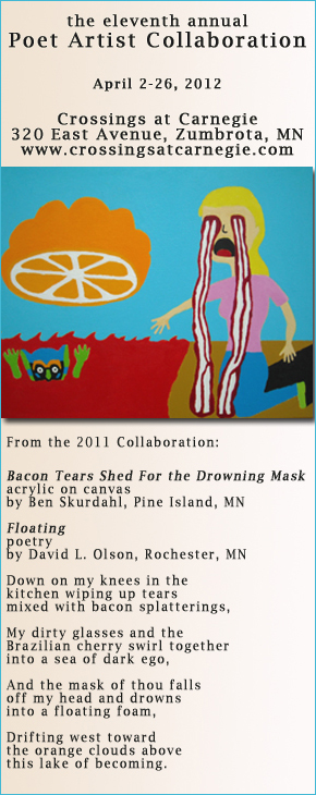 I’ll find out on Saturday, April 21, when I attend a reception beginning at 7 p.m. at Crossings at Carnegie, 320 East Avenue, in Zumbrota. Poets and artists will discuss their works. Please join me and the 25 other poets and 26 artists at this celebration during April, National Poetry Month.