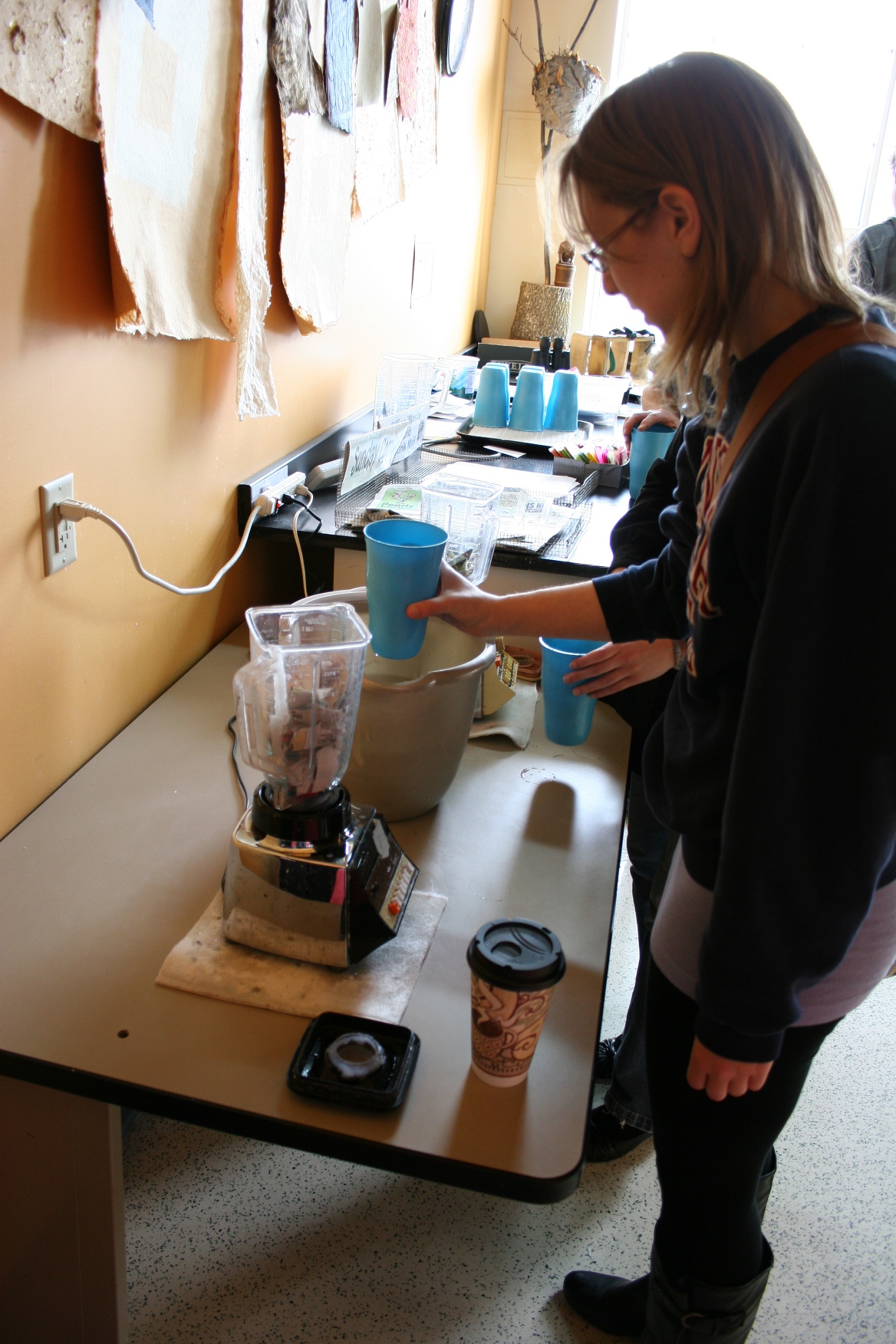 Here you can add condiments (that's what I call them) like glitter and pressed flowers to the mix before blending in an ancient blender. A garage sale blender would work great for this part of the paper making. On the left is one of the patient paper making volunteer instructors. That's my husband waiting his turn.