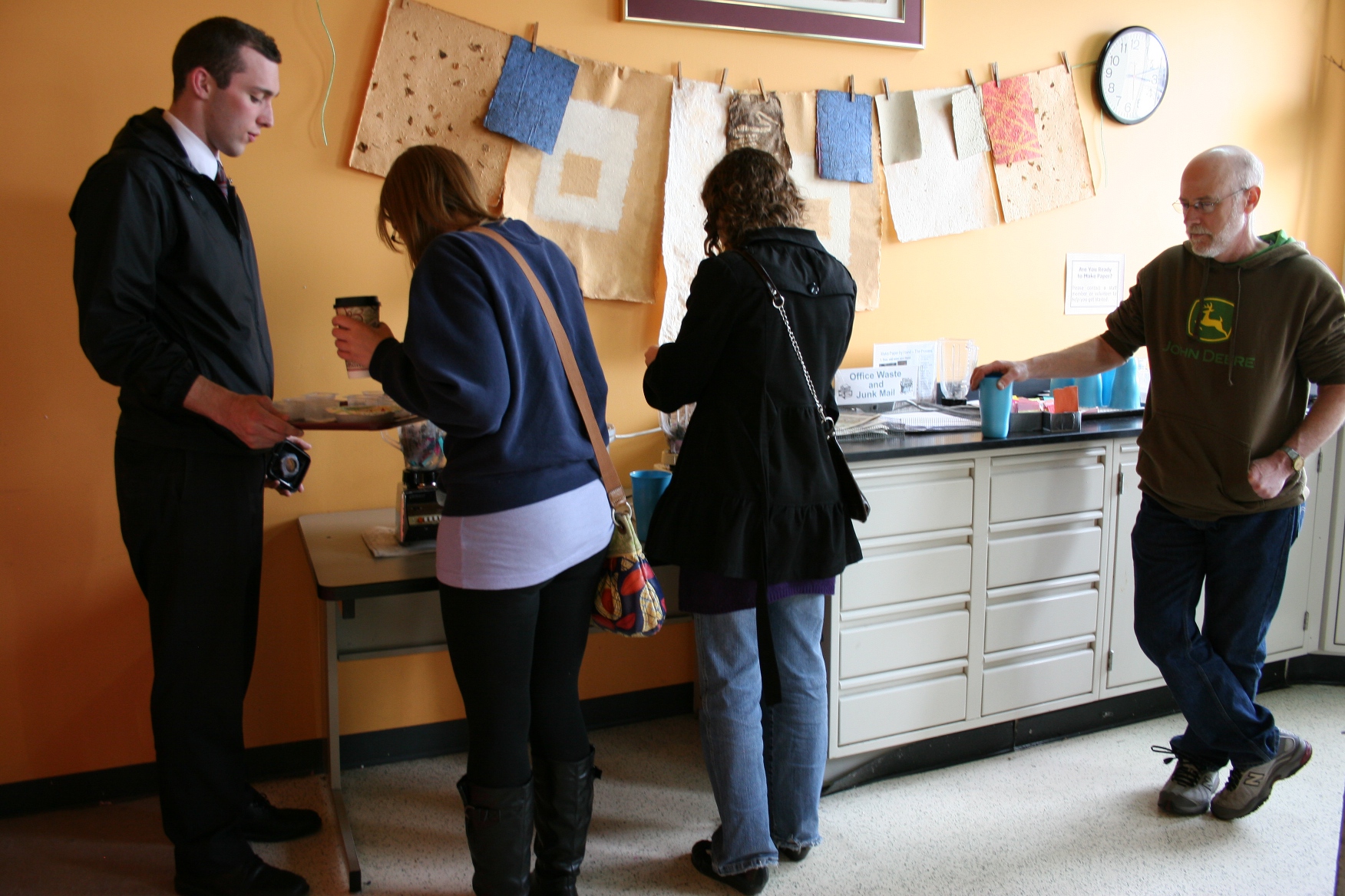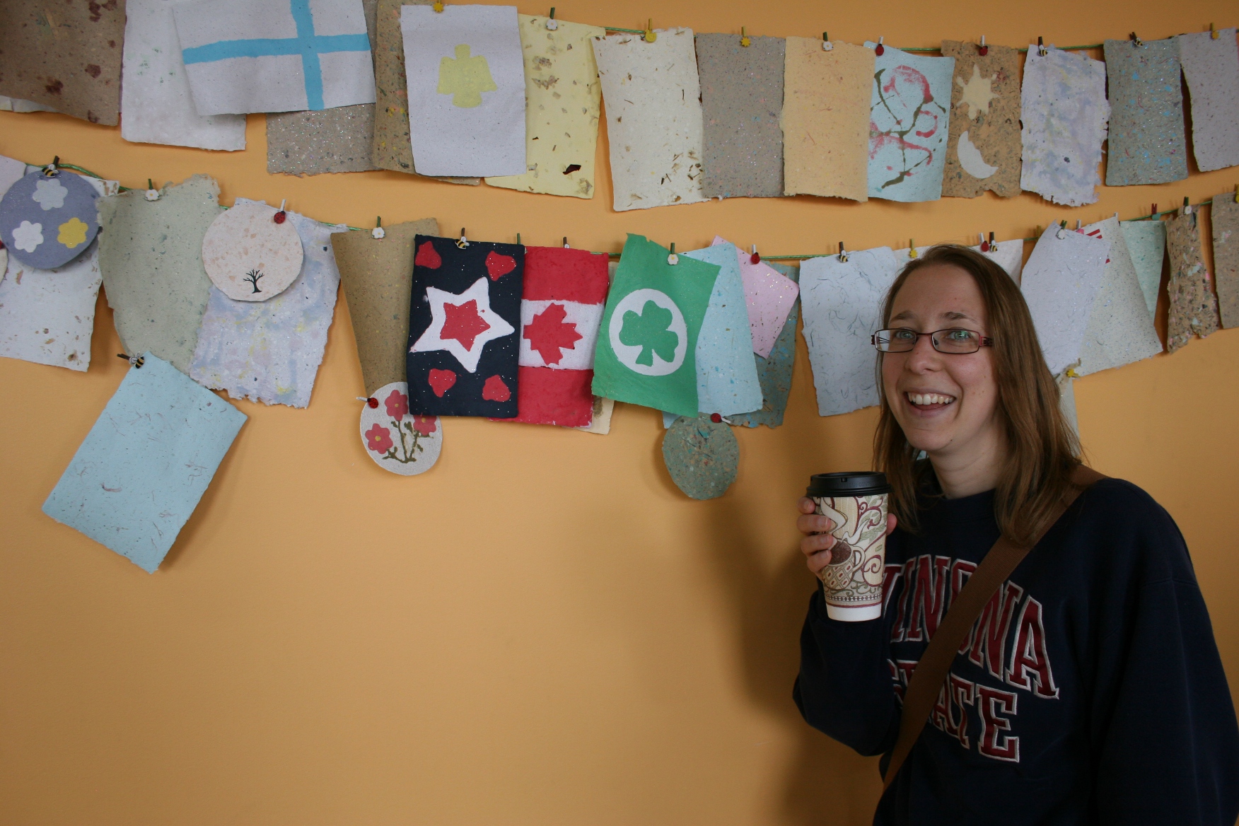 First, peruse the paper samples to determine what type of paper you would like to make. Ideally, you (your daughter) should drink your (her) coffee before coming to The Paper Discovery Center. But, if you (your daughter) are (is) fortunate enough, the nice lady at the front desk will allow you (your daughter) inside with your (her) coffee as long as you (she) promise (s) to keep a lid on it (the coffee cup, that is).