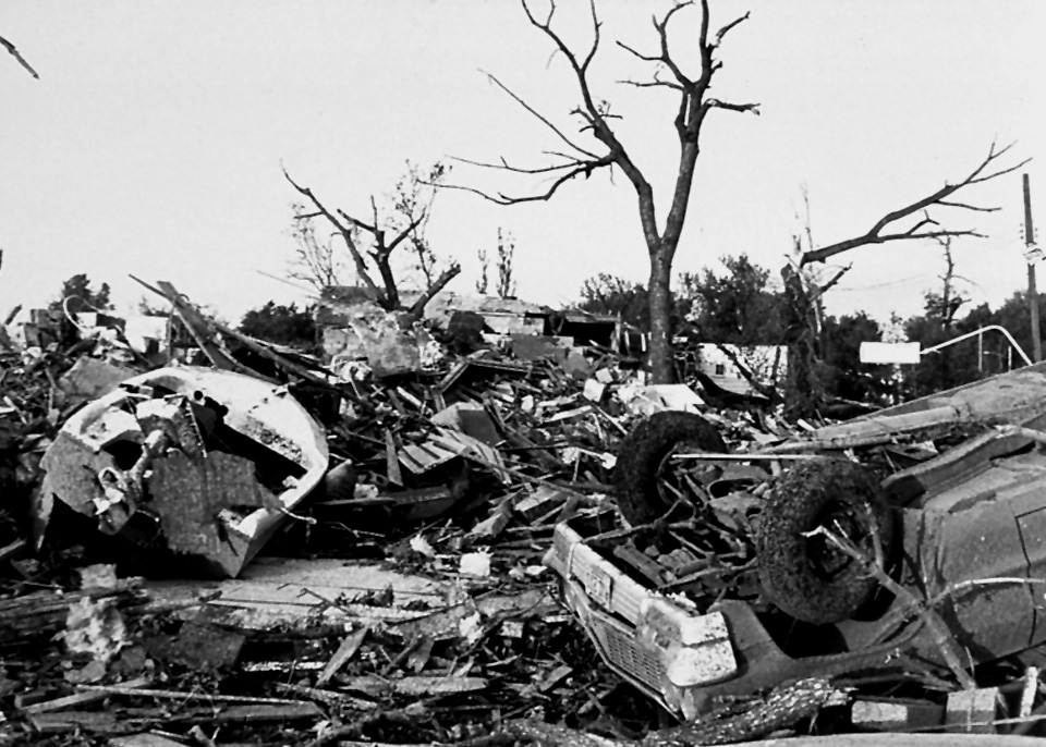 This photo by the Tracy Headlight Herald shows a damaged boat and overturned car sitting atop the rubble after the Tracy tornado.