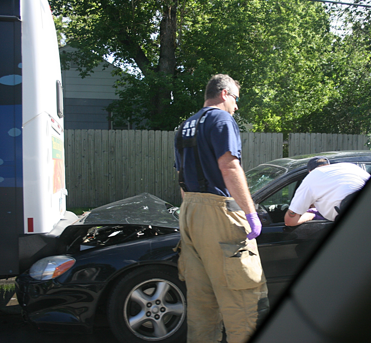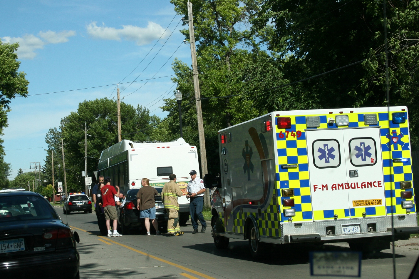 Thursday evening while traveling on a Fargo city street, we were caught in the middle of this scene in which a car rear-ended a bus.