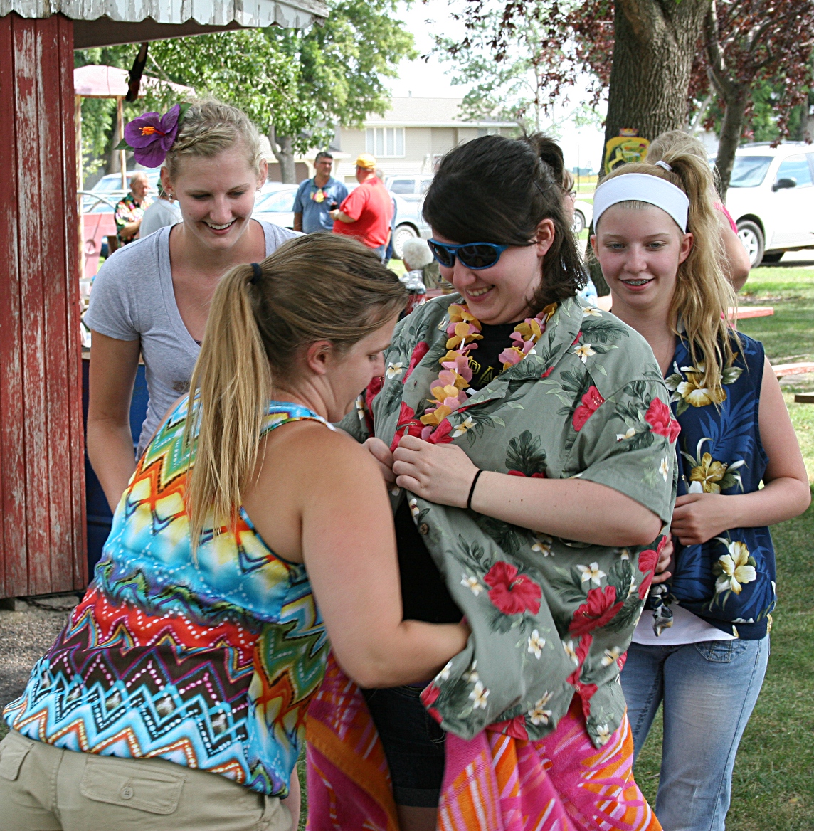 It didn’t take much persuading to get the young adults participating in the Tacky Tourist Relay, helping each other slip into Hawaiian garb and more during our Hawaiian Luau themed reunion.
