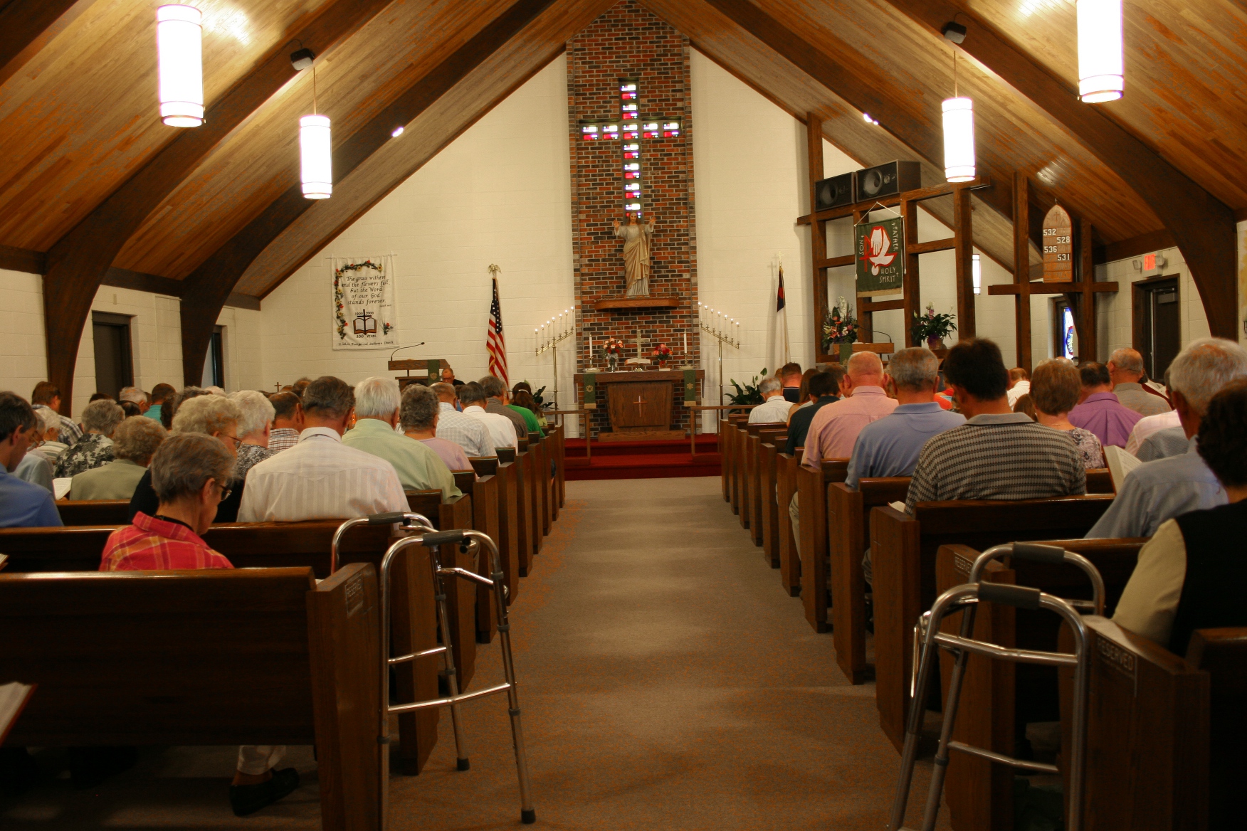 Worshipers gathered July 1, 2012, in the repaired sanctuary with overflow into the social hall.