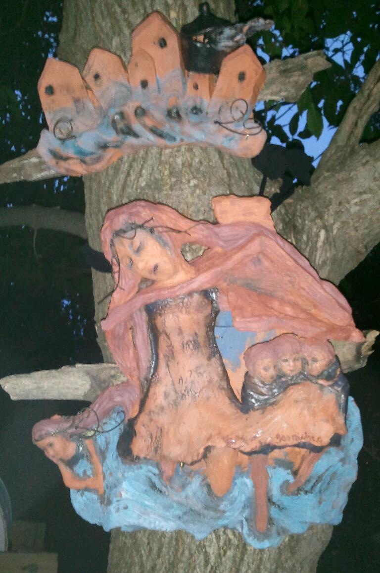 Outside of Faribault, lashed onto a tree along a bike trail, Amato switches to a rural theme in “Prairie,” a definitive piece which connects to her prairie roots. The sculpture was partially-influenced, she says, by “the solitude and perseverance of the prairie woman in her battles with so many forces—the soil, the wind, the grasshoppers, the fires.”