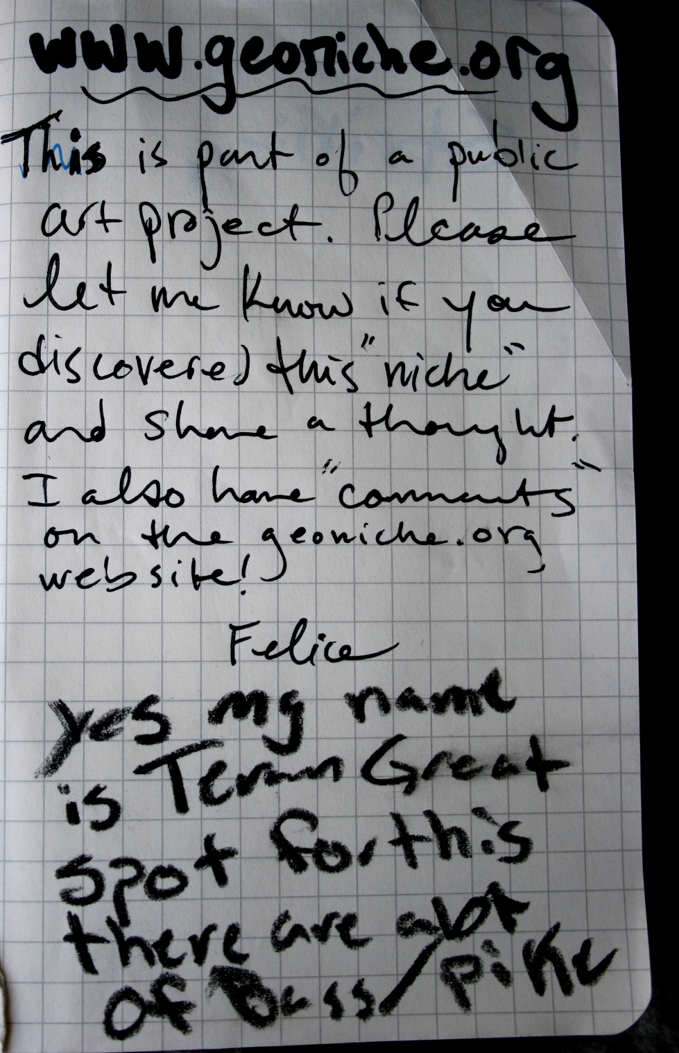 “The idea (GeoNiche) delights me,” says Kreger who has been geocaching for half a dozen years everywhere from New York City to the Oregon coast and as near as a local county and city parks. “Turning the corner, seeing another’s idea of beauty in an unexpected spot, it’s one of those unanticipated sweet spots in life.”