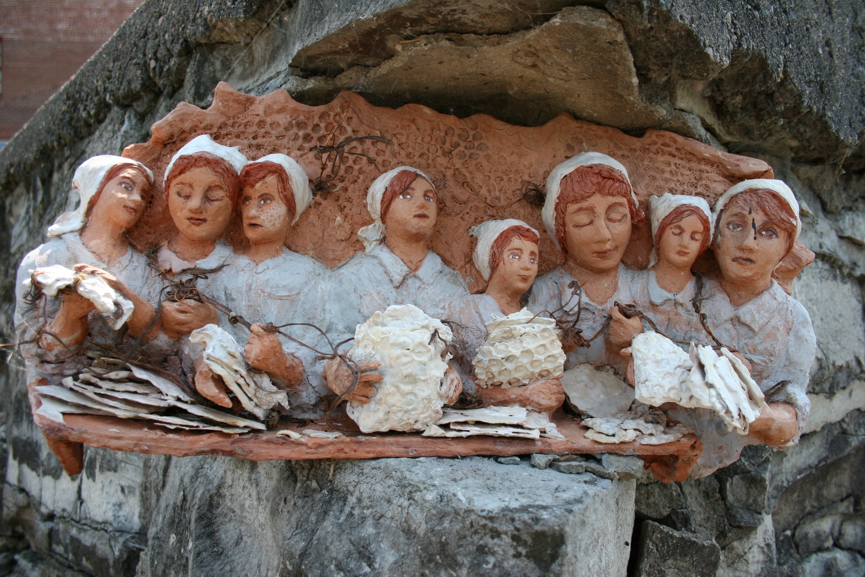 Amato’s sculptures tell a story as seen in this close-up of woolen mill factory workers. Her sculptures are made from paperclay with wire details. Photo by Audrey Kletscher Helbling