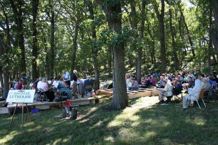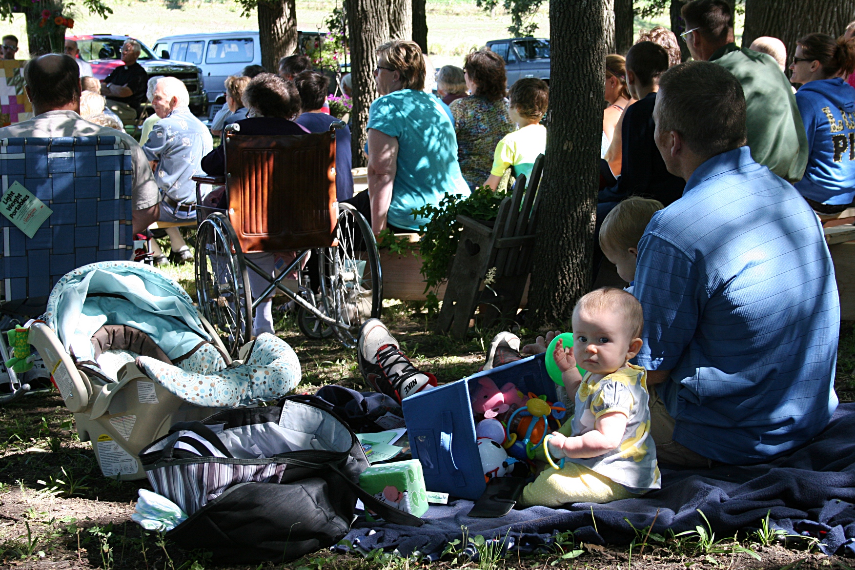 On Sunday there were no ball games or kids racing for a rare treat of pop. But plenty of kids—from babies to teens—settled onto temporary wood plank benches and lawn chairs or upon blankets or in car seats on the same ground in Marquardt’s Grove that has, for generations, served as an outdoor house of worship on one Sunday in August.